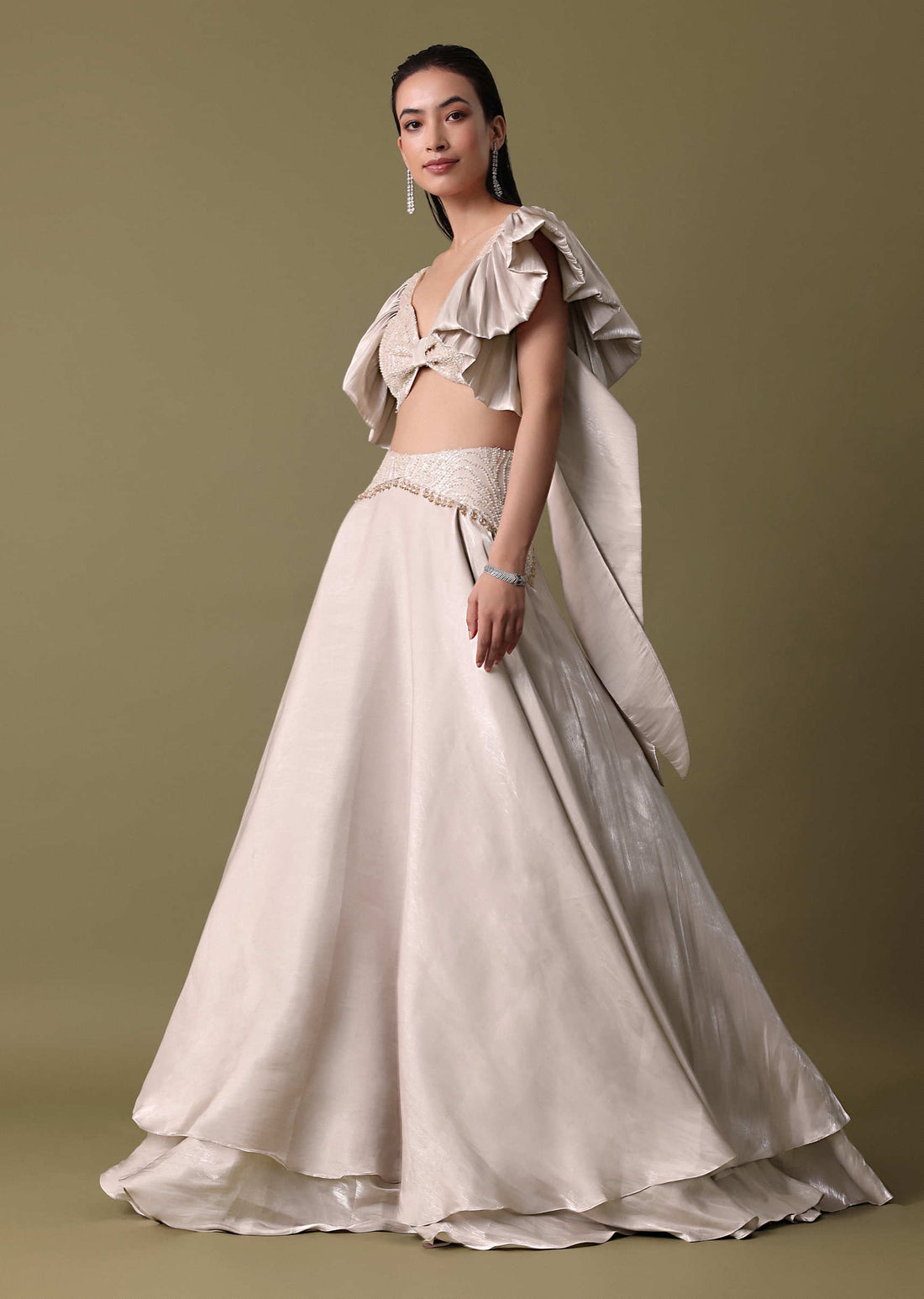 Dusty Lilac Embroidered Long Jacket With Ruched Lehenga