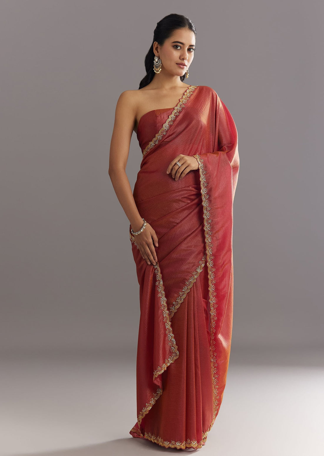 Dark Peach Crushed Tissue Embroidered Saree With Scallop Border