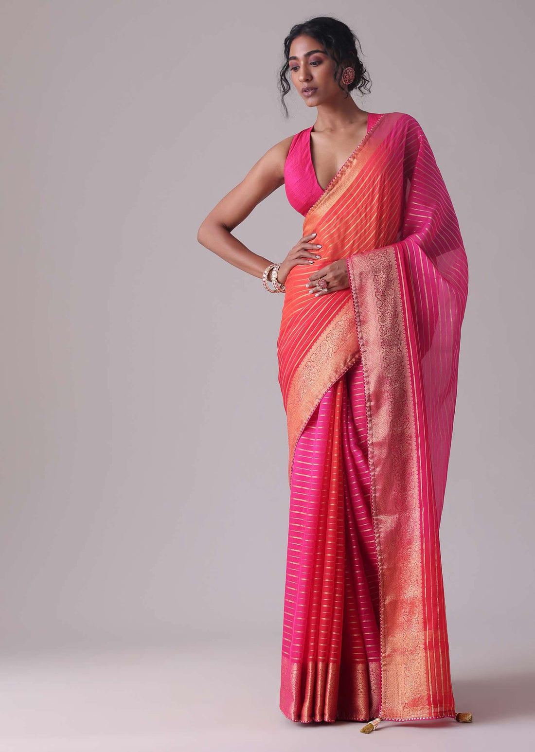 Hot Pink And Orange Chinon Saree With Heavy Embroidery