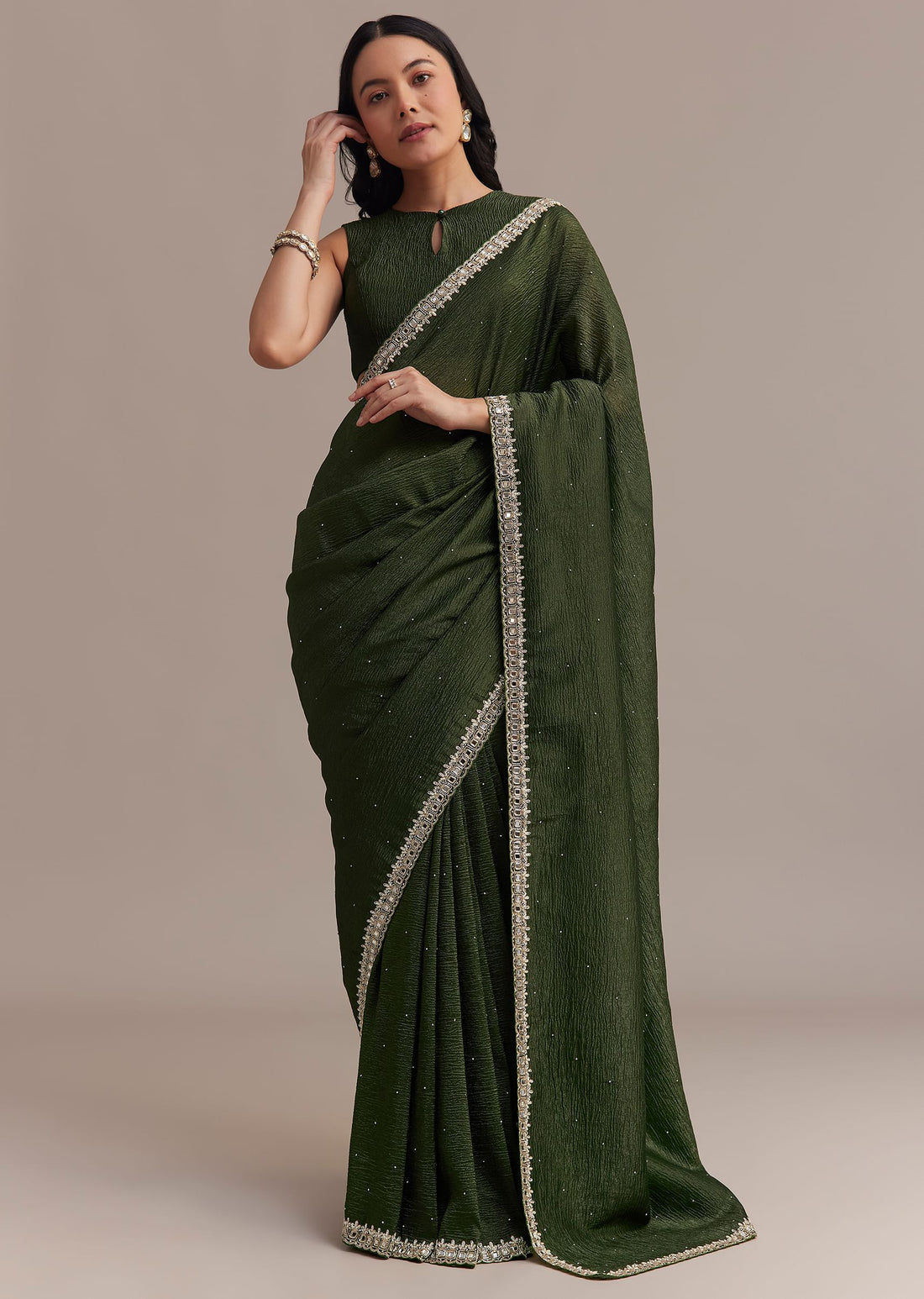 Mehendi Green Crushed Tissue Saree With Embellished Border