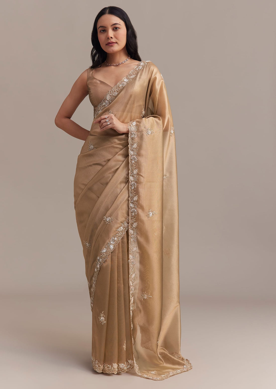 Metallic Gold Organza Tissue Saree With Cutdana And Bead Embroidery