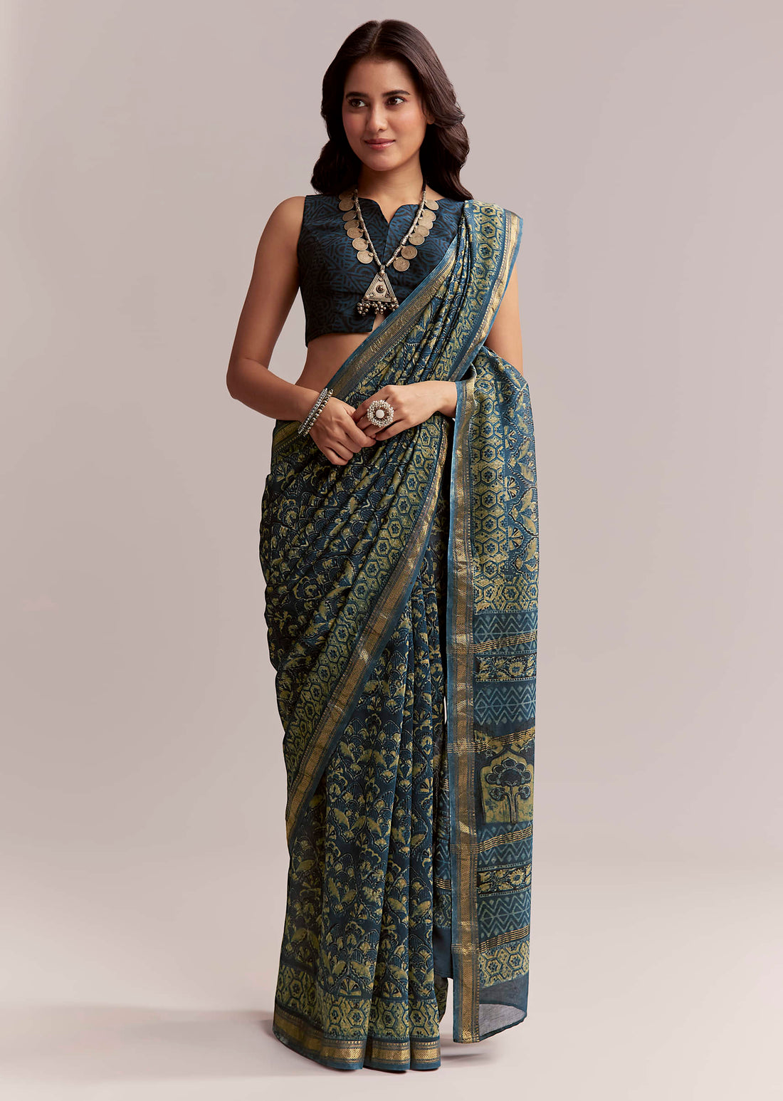 Midnight Blue Linen Printed Saree With Traditional Ajrakh Print