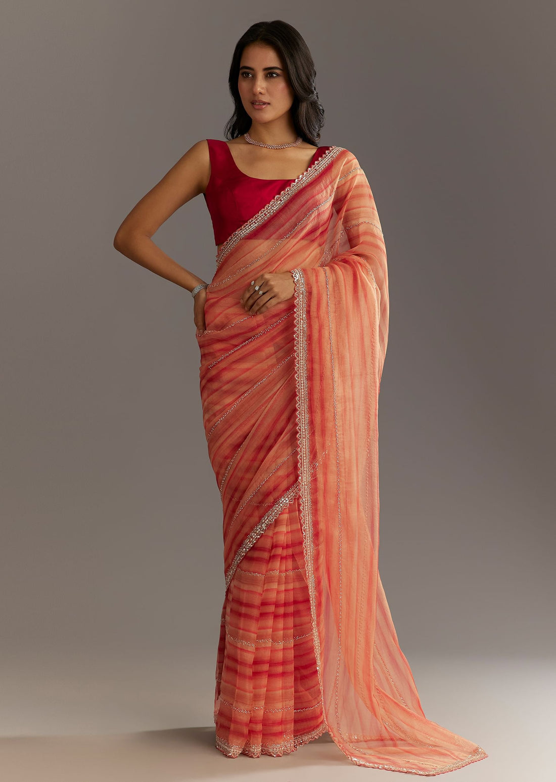 Peach Red Shaded Tissue Saree With Cutwork Scallop Border
