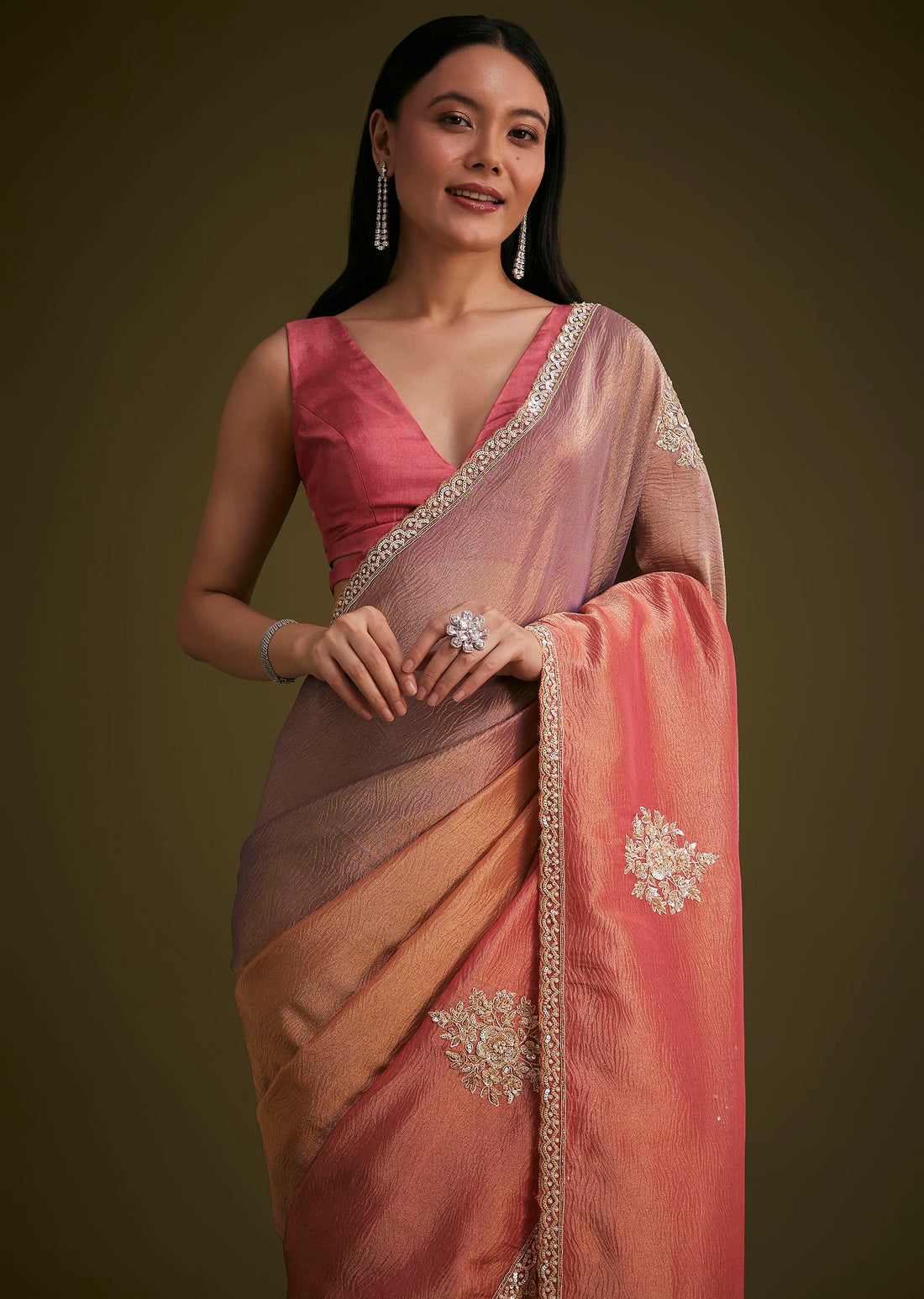 Peach Tissue Saree With Floral Moti And Cutdana Embroidery