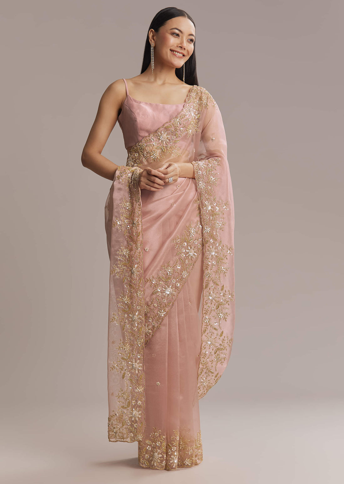Pink Tissue Saree With All Over Stone Embellishment And Cutdana Scallop Border