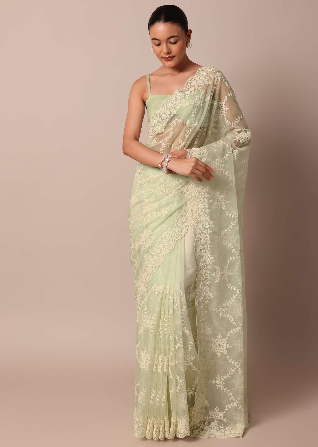 Pista Green Organza Silk Chikankari Saree With Floral Thread Jaal Work And Unstitched Blouse Fabric