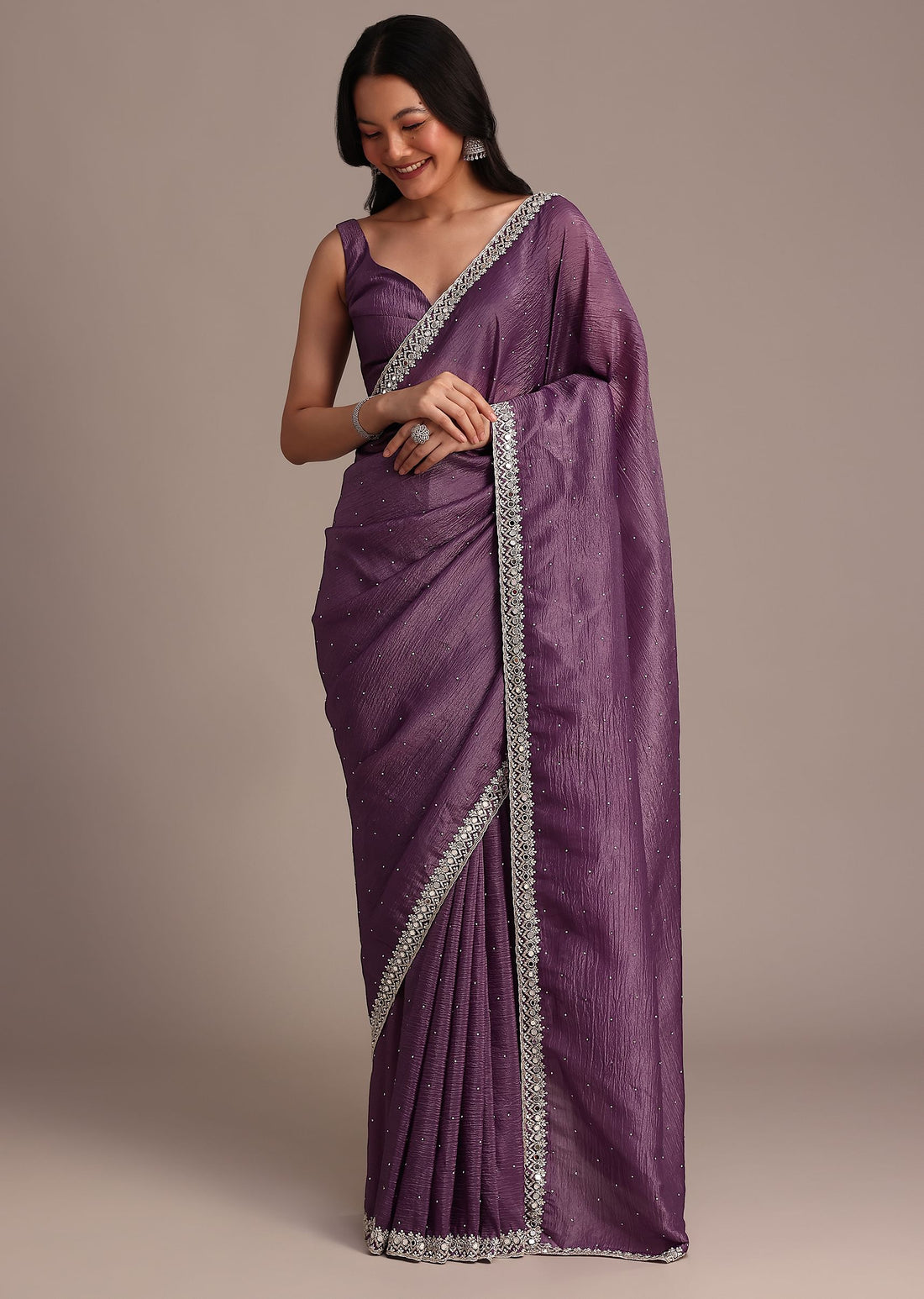 Purple Crushed Tissue Saree With Mirror And Cutdana Embellished Border