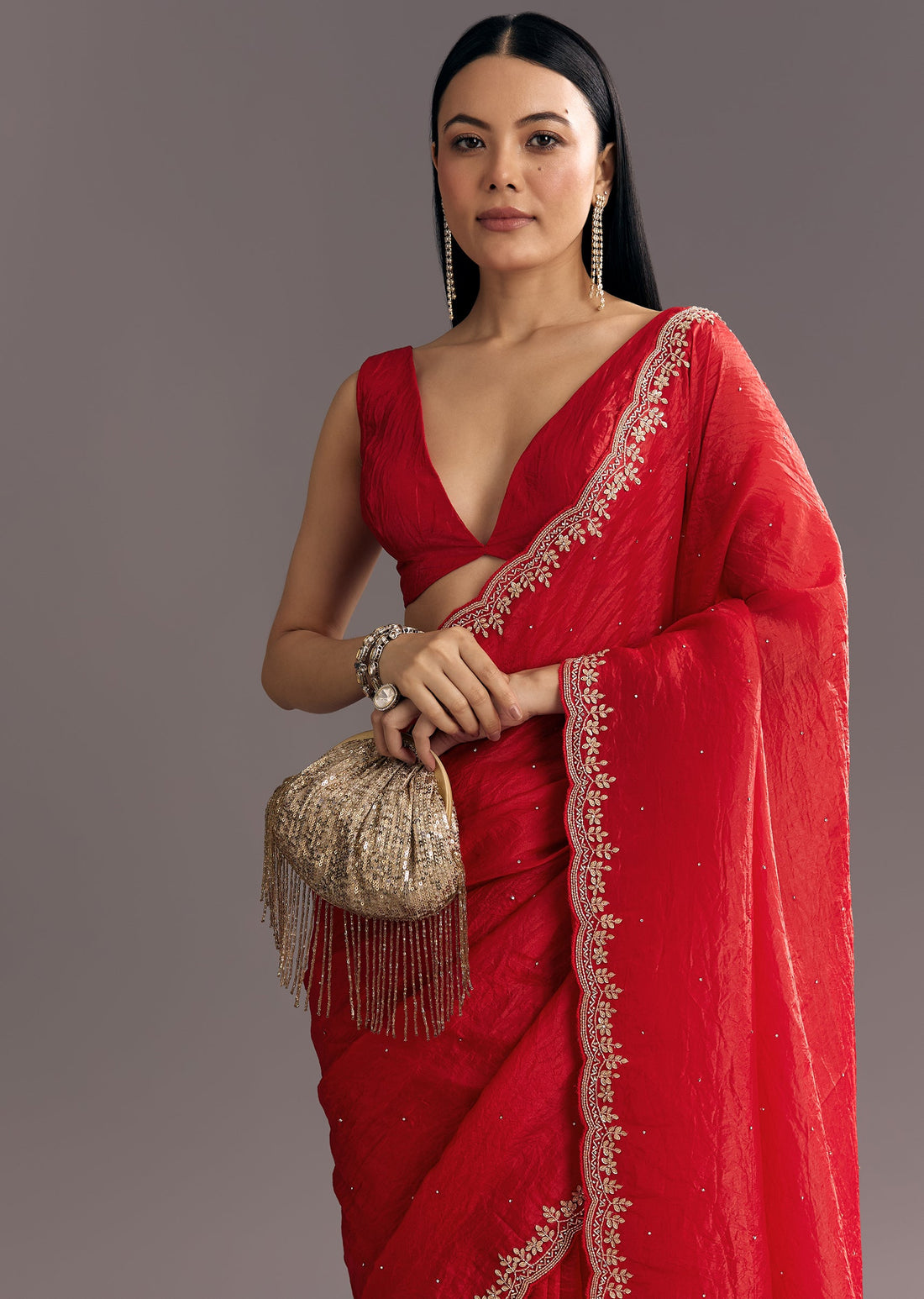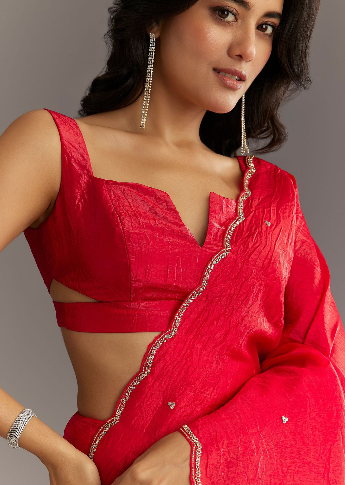 Red Crushed Tissue Stone Embellished Saree With Cutdana Scallop Border
