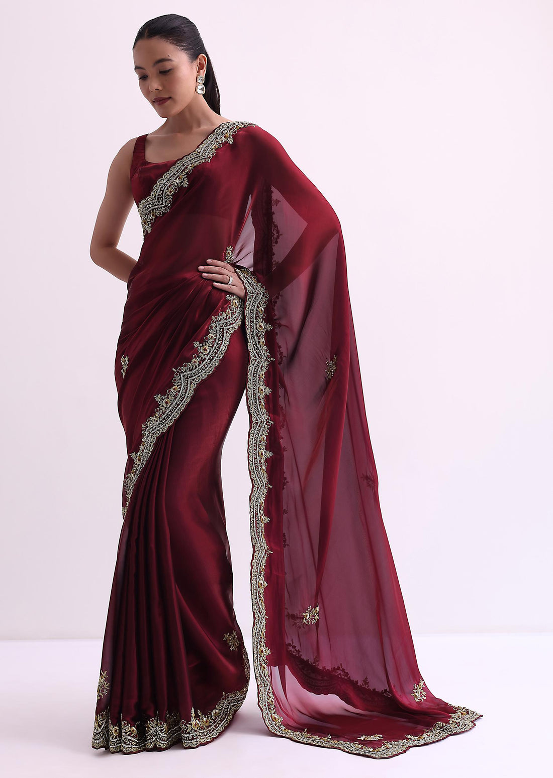 Red Glass Tissue Saree With Sequin Scallop Border And Unstitched Blouse Fabric