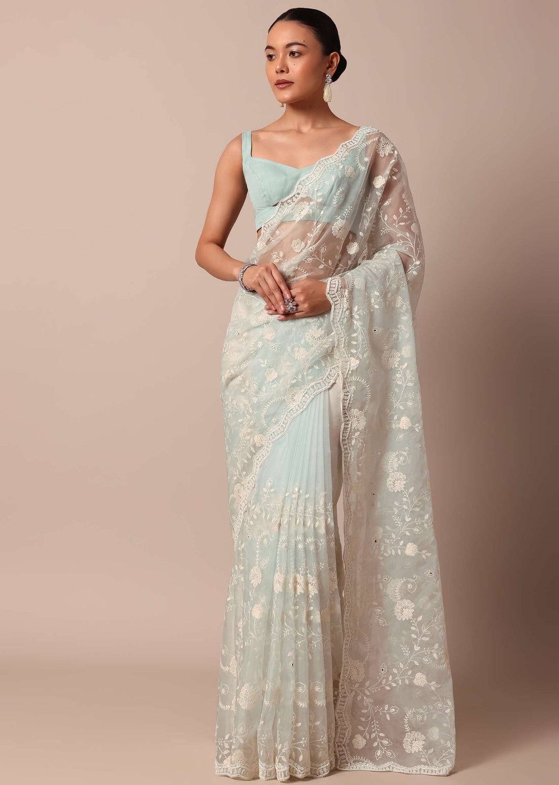 Sky Blue Chikankari Saree In Organza Silk With Scallop Border And Unstitched Blouse Fabric