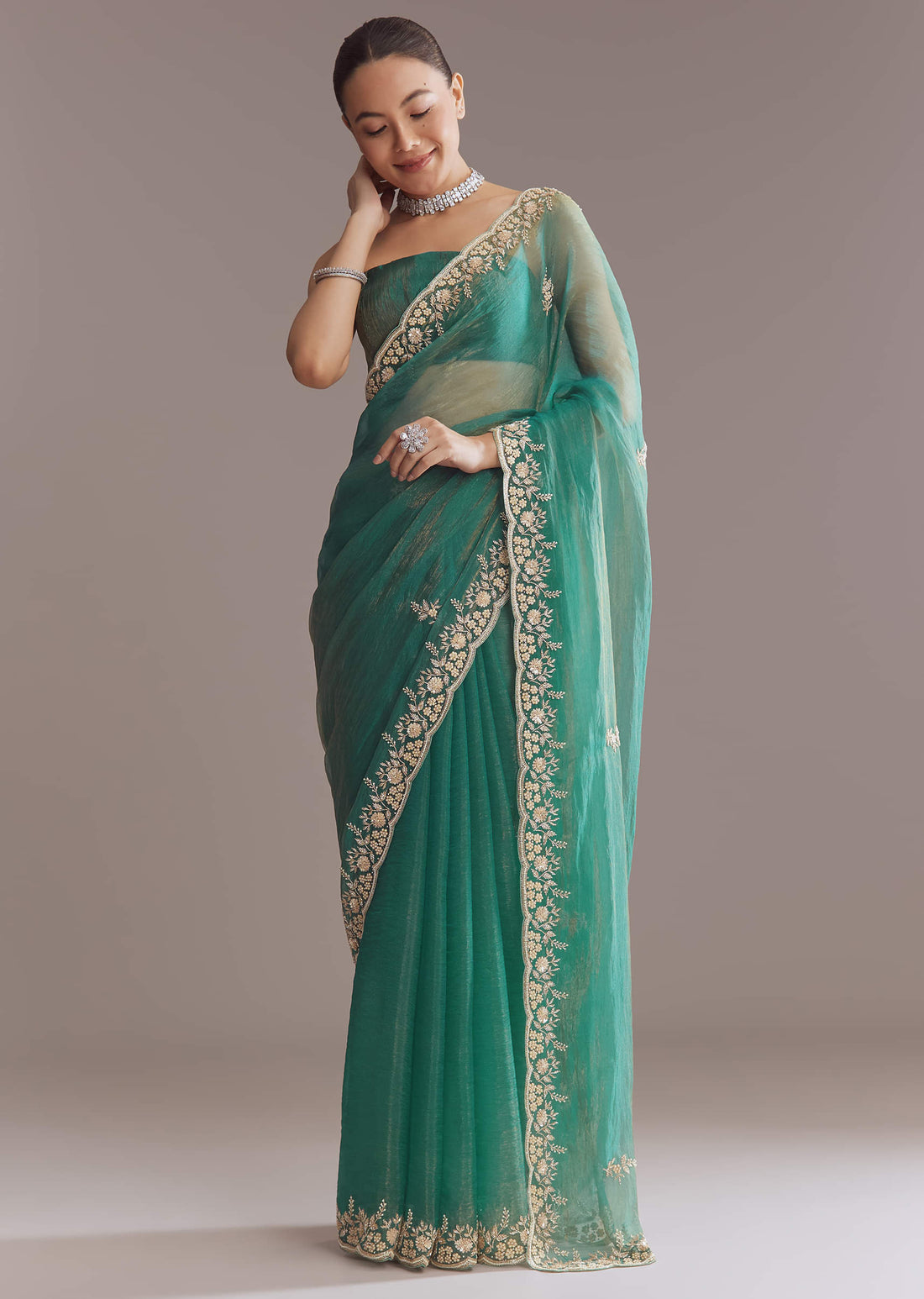 Teal Green Satin Saree With Zardosi Moti Embroidery And Scallop Border