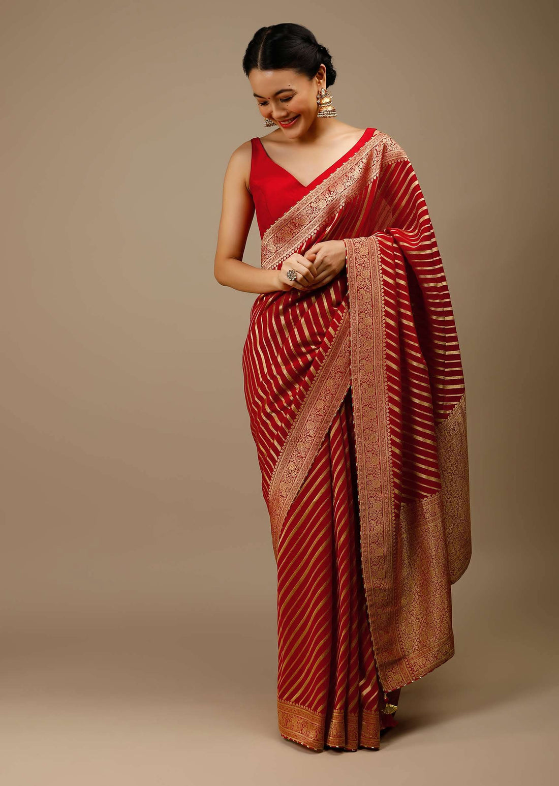 Tomato Red Saree In Georgette With Brocade Woven Diagonal Stripes And Floral Border