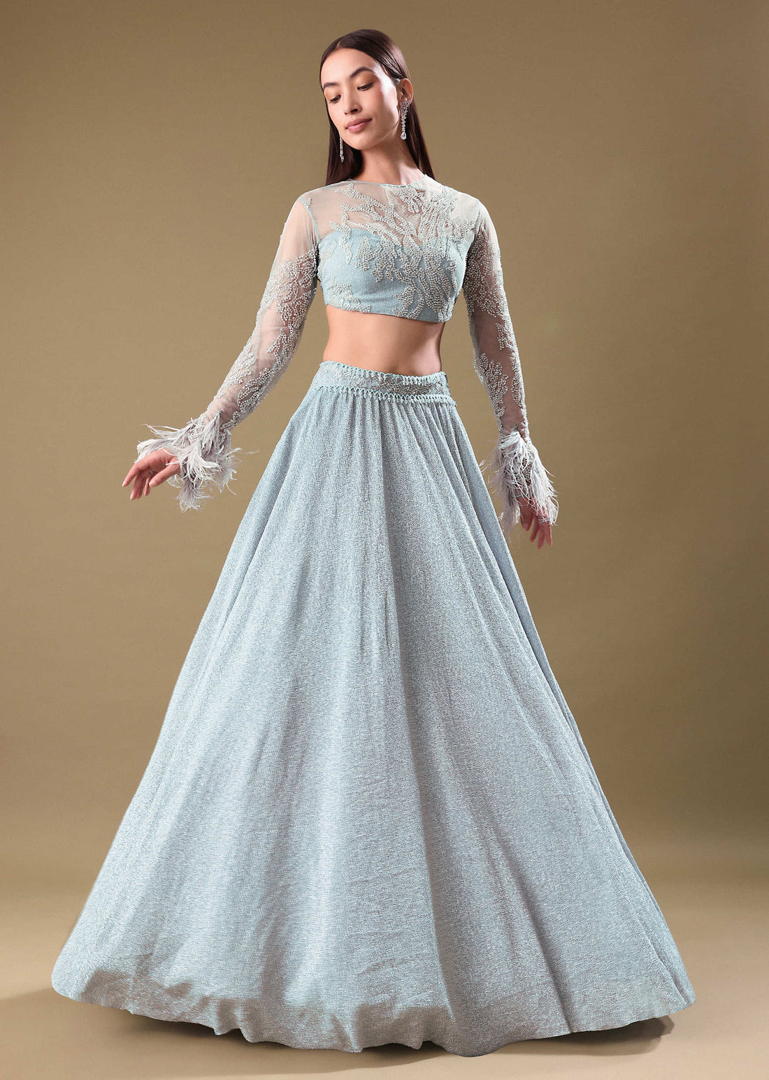 Turquoise Blue Sequin Skirt With Embroidered Blouse