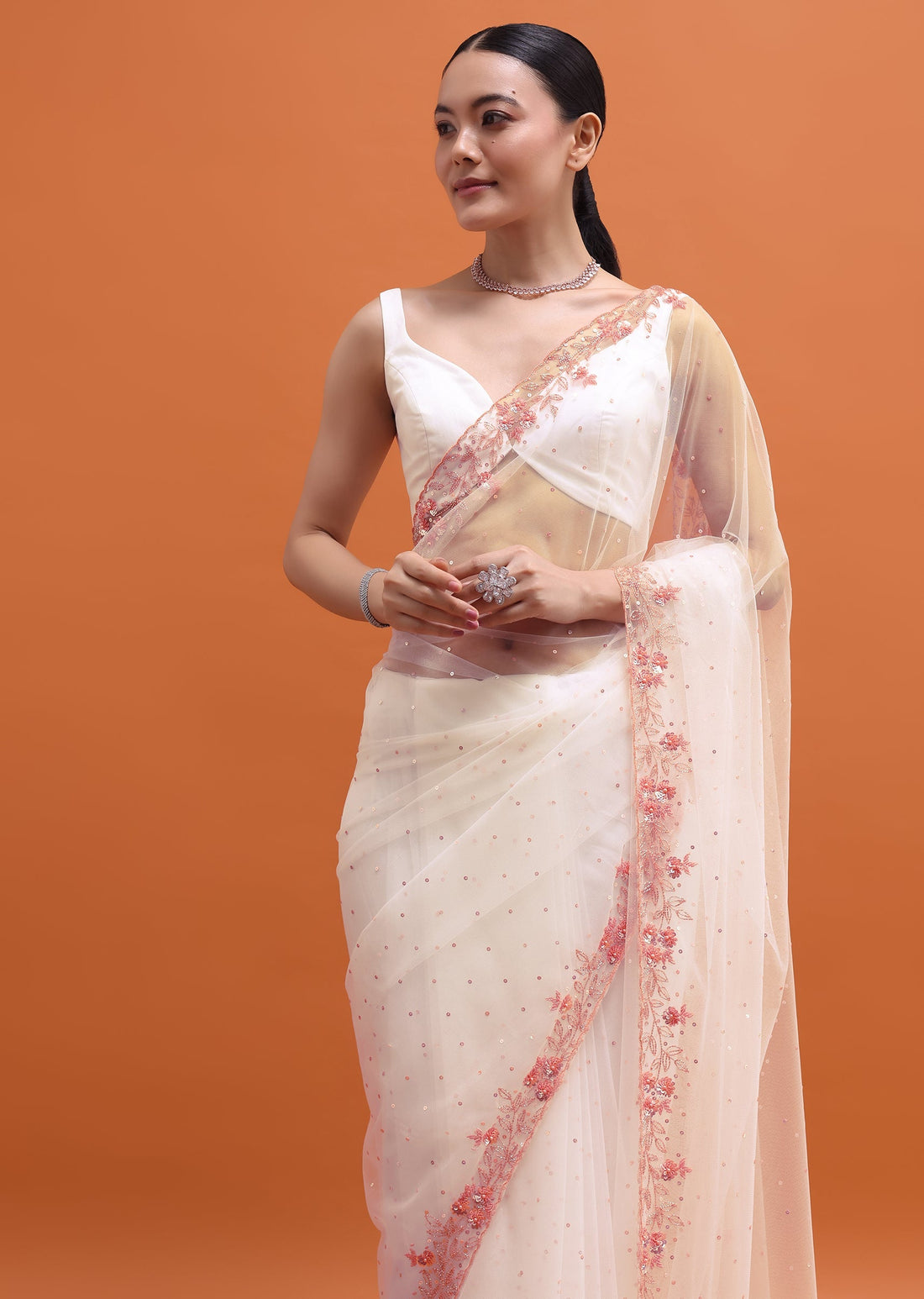 White Embroidered Net Saree In Sequin With Unstitched Blouse