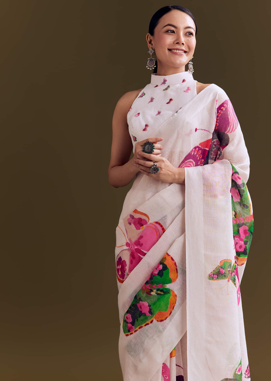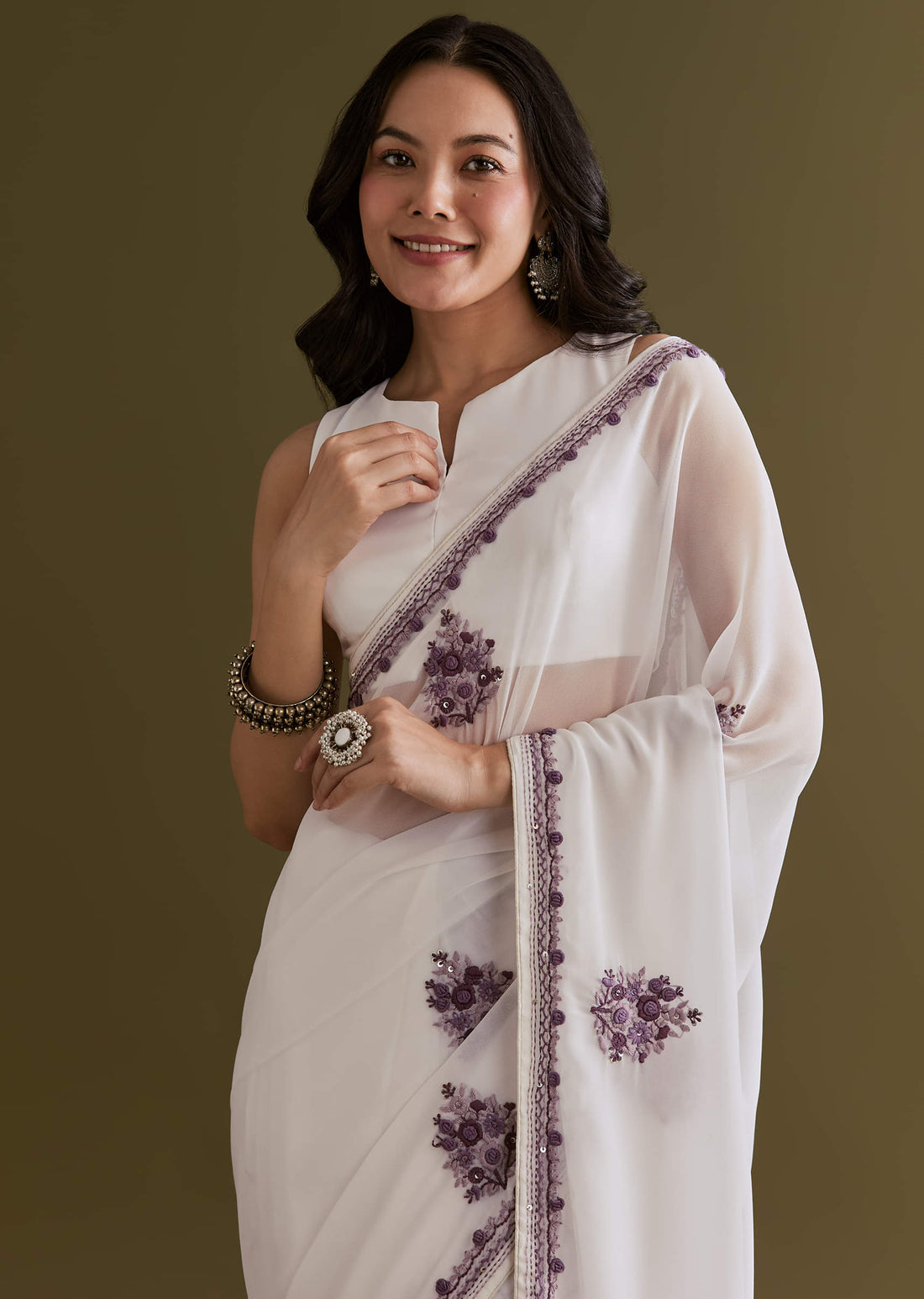 White Chikankari Saree In Organza Silk With Beaded Scallop Detail And Unstitched Blouse Fabric