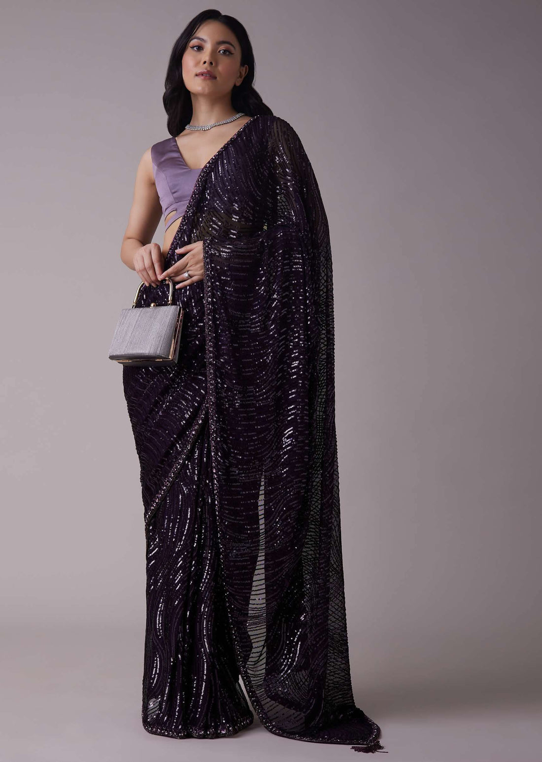 Wine Crushed Tissue Silk Cutdana Scallop Bordered Saree