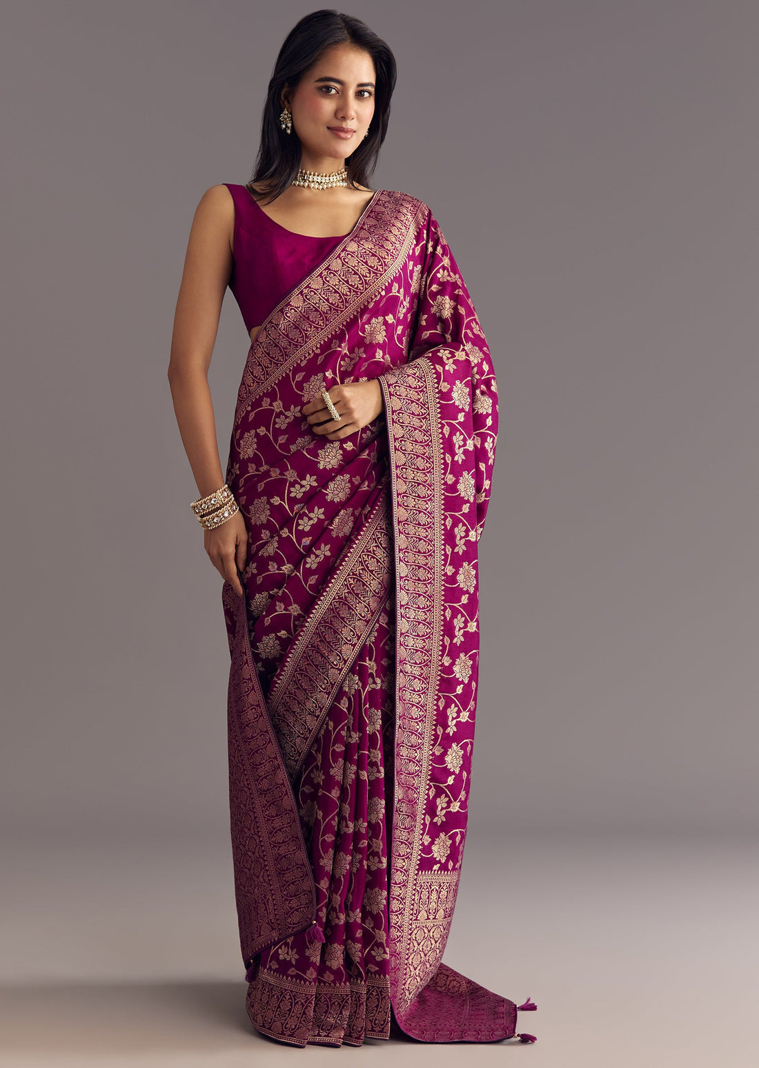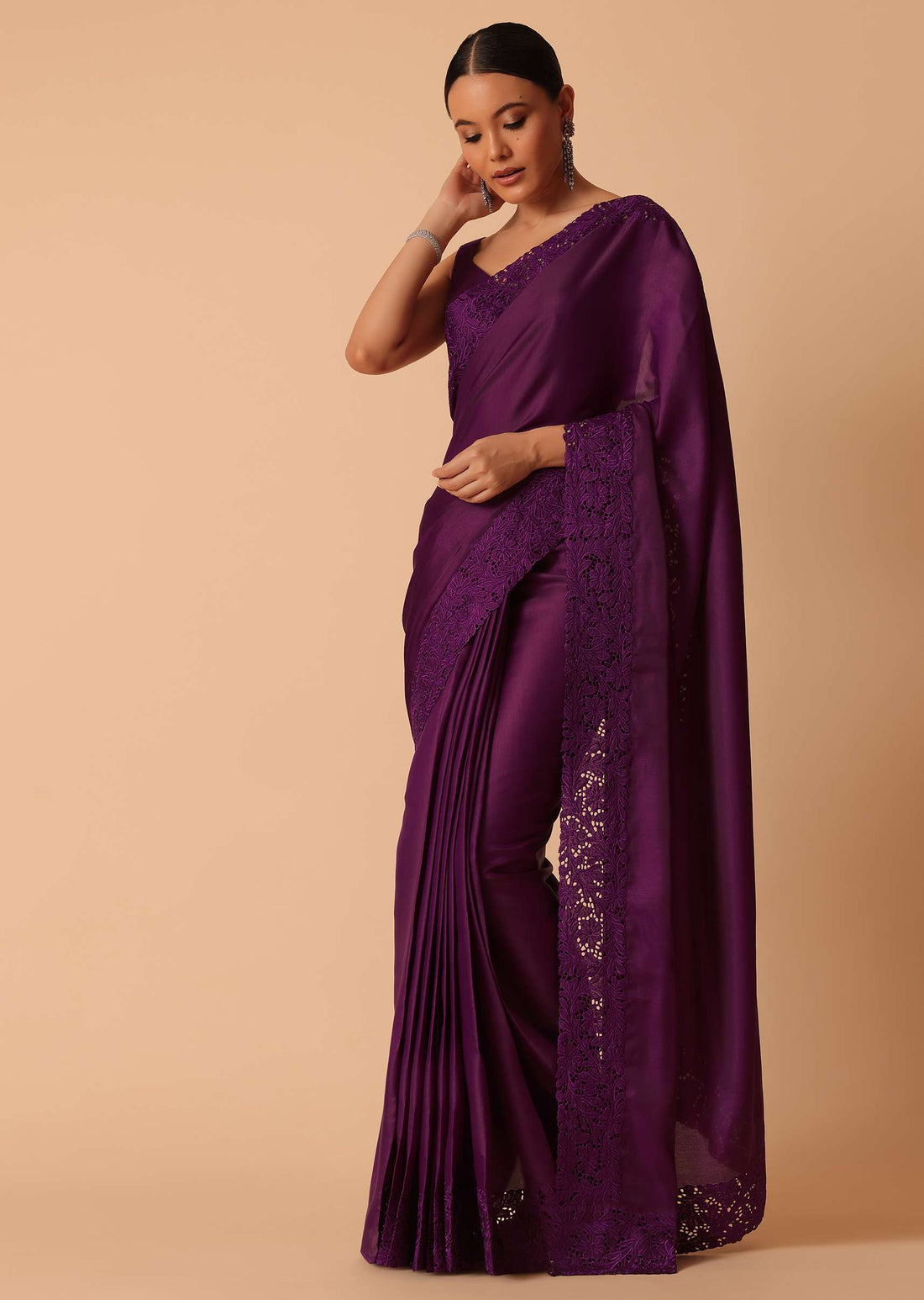 Wine Crushed Tissue Silk Saree With Cutdana Scallop Border