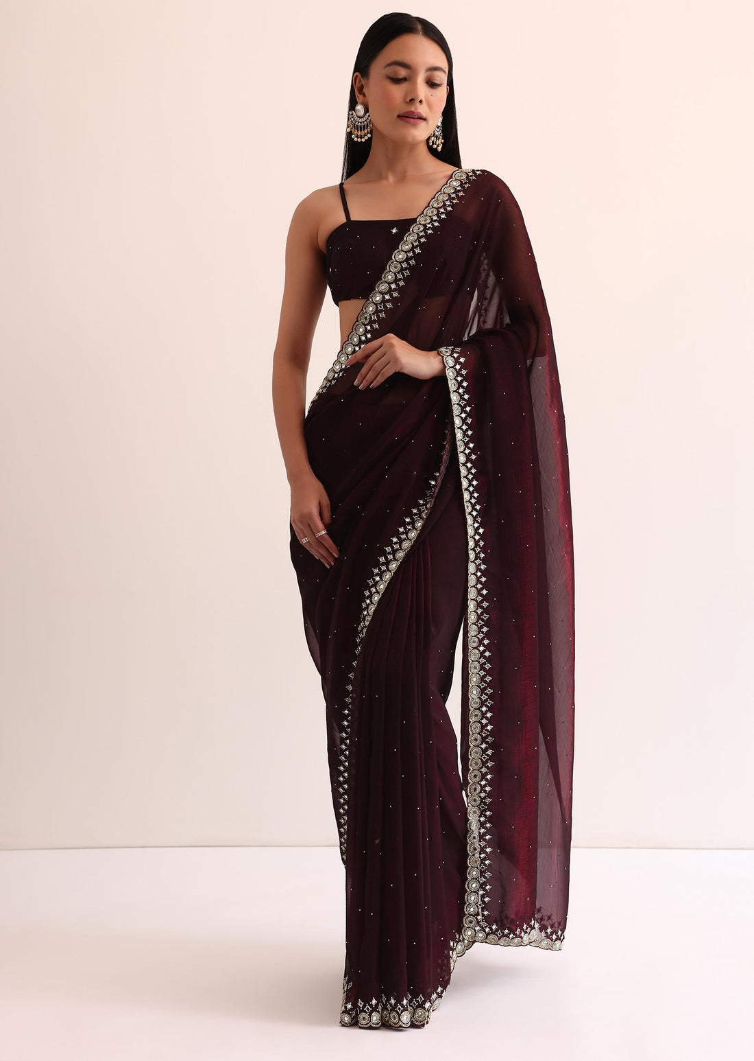Wine Crushed Tissue Saree With Stone Embellished Border