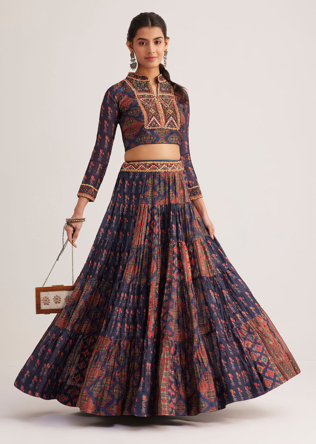 Navy Blue Lehenga Choli With Sequins Stripes And Multi Colored Resham Work