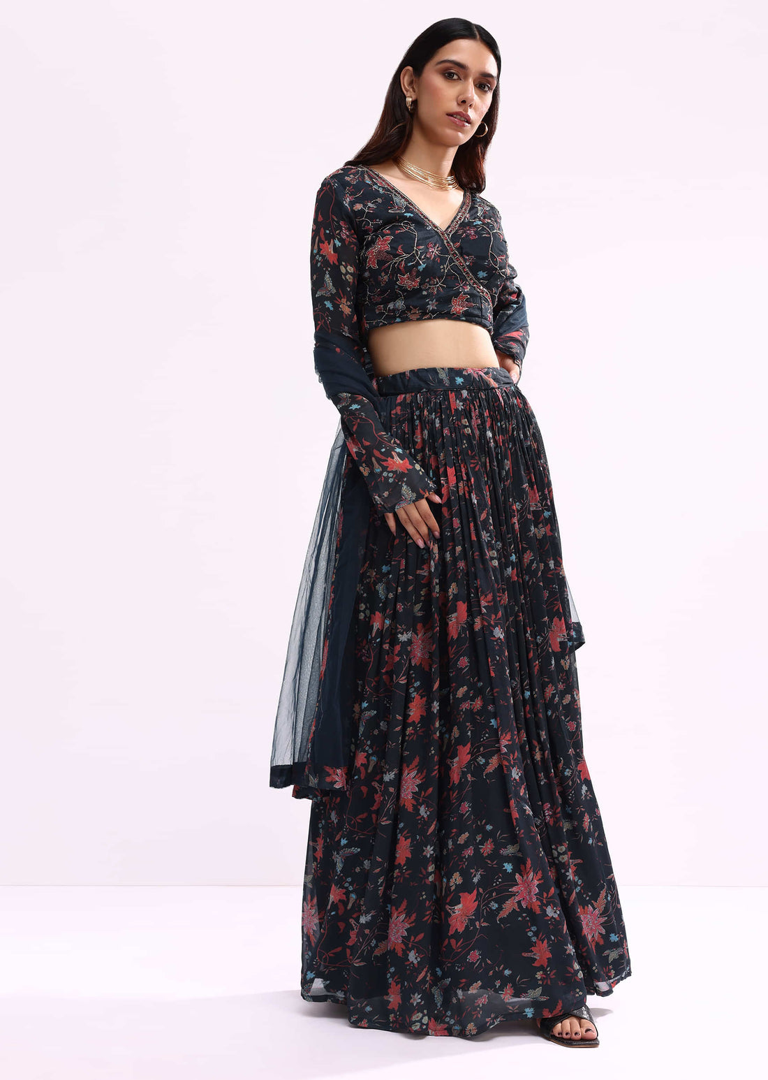 Midnight Black Printed Chiffon Lehenga Choli Set