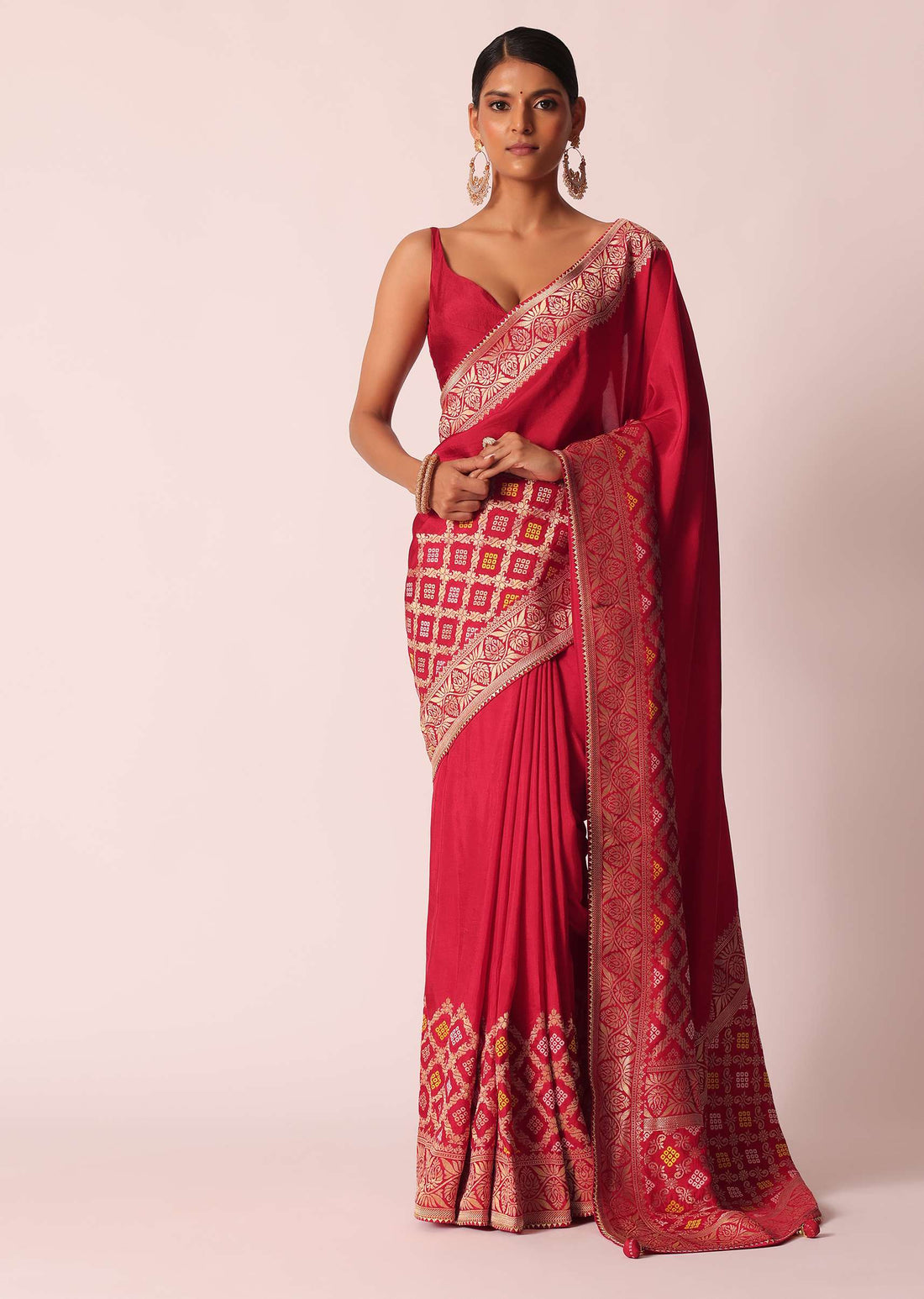 Red Silk Woven Saree With Bandhani Detail And Unstitched Blouse Piece