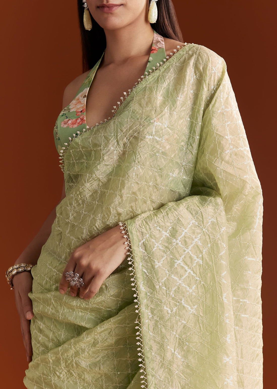 Green Glass Tissue Saree With Sequins And Cutdana Beaded Border