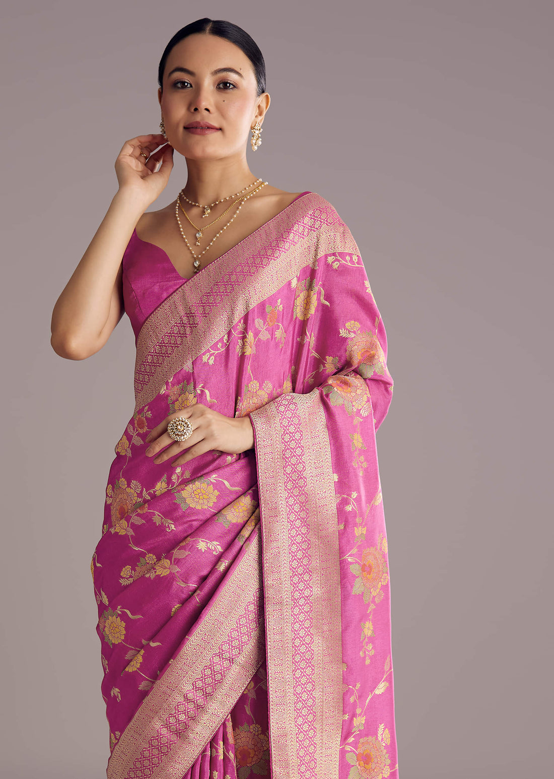 Onion Pink Dola Silk Saree With Multicolor Floral Jaal Weave