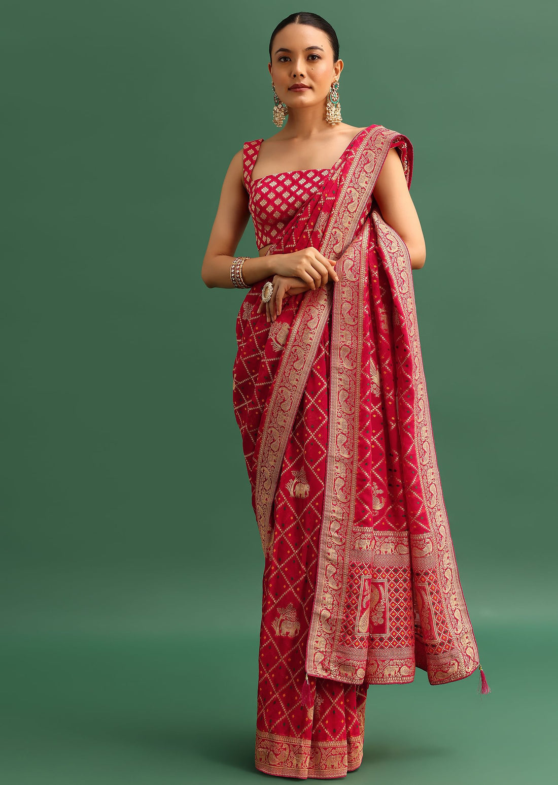 Rani Pink Woven Saree In Silk with Bandhani Detail And Unstitched Blouse Piece