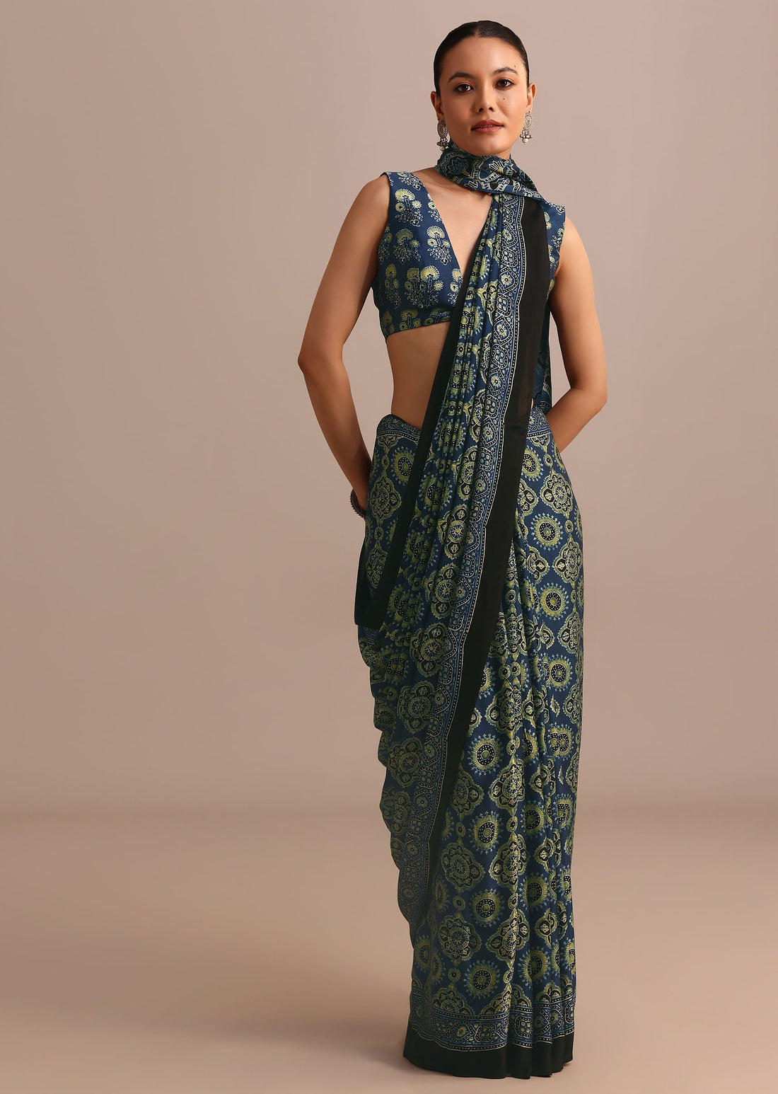 Indigo Satin Modal Handblock Printed Ajrakh Saree