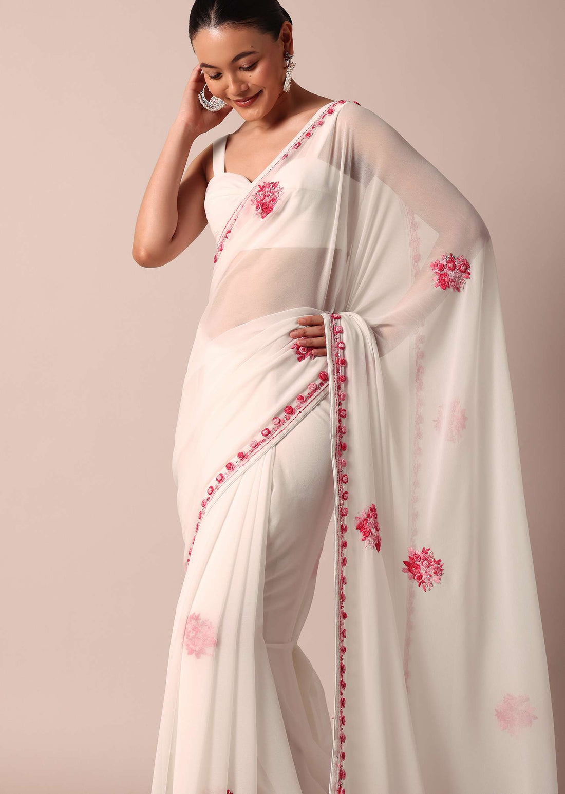 White Saree With Floral Embroidery And Unstitched Blouse Piece