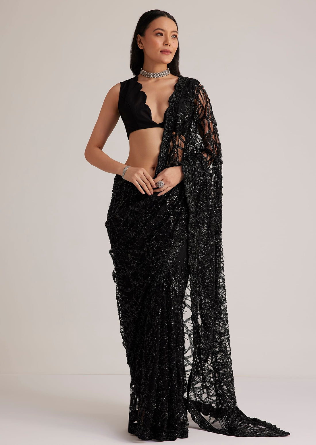 Black Net Saree With Sequins And Stones Embroidery