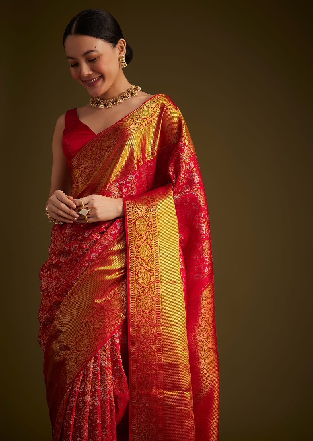 Red Kanjivaram Silk Saree With Golden Zari Detailing