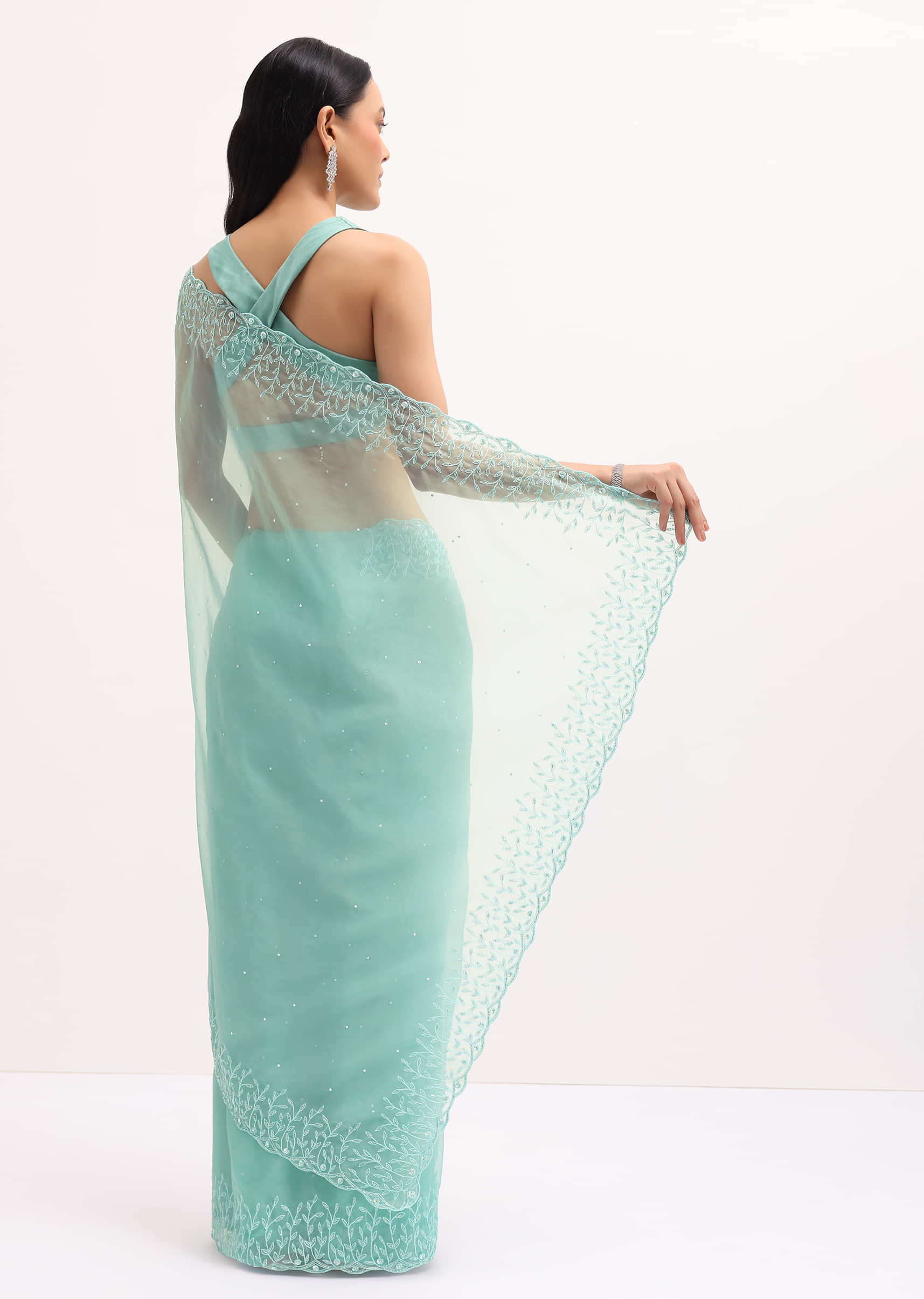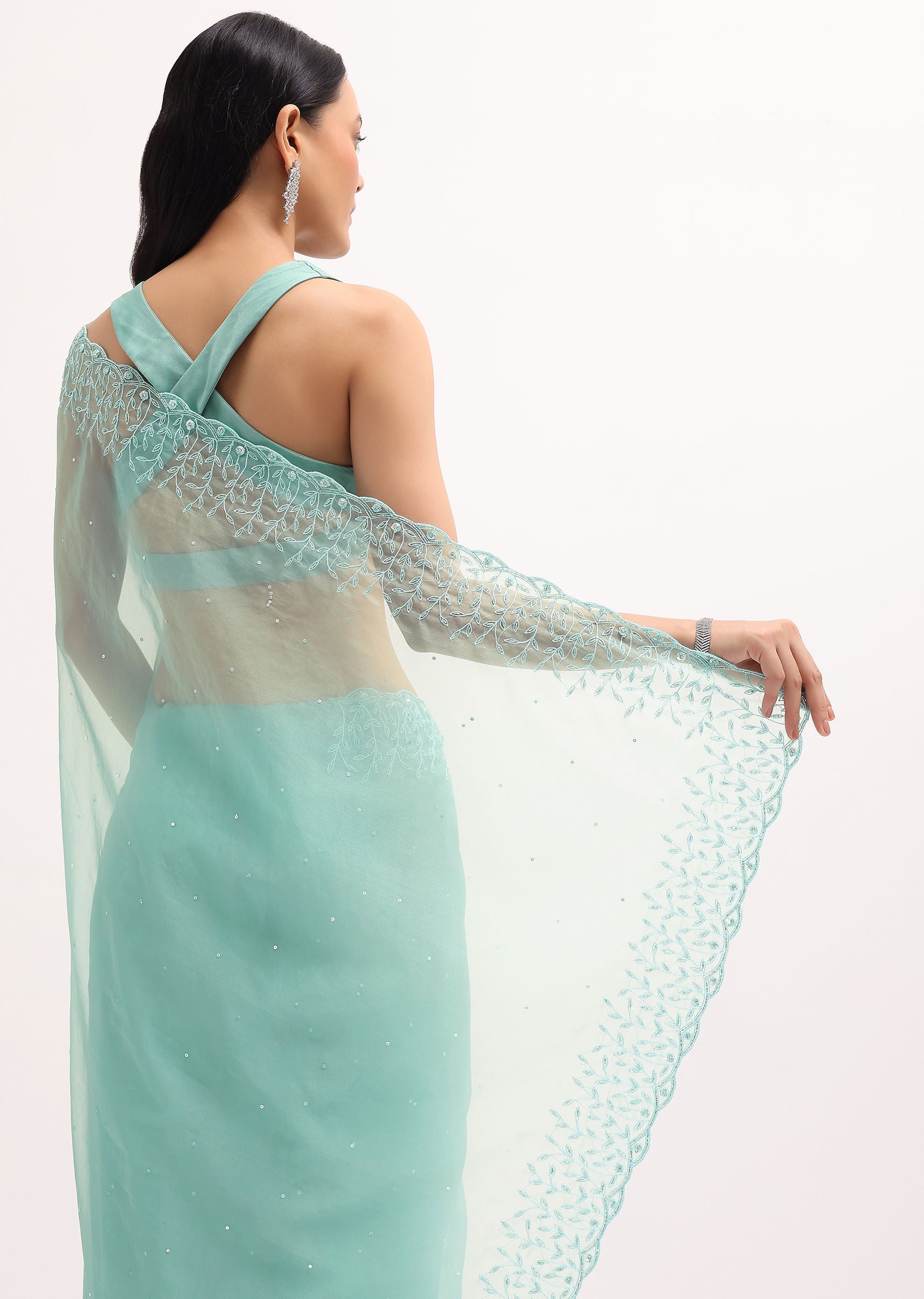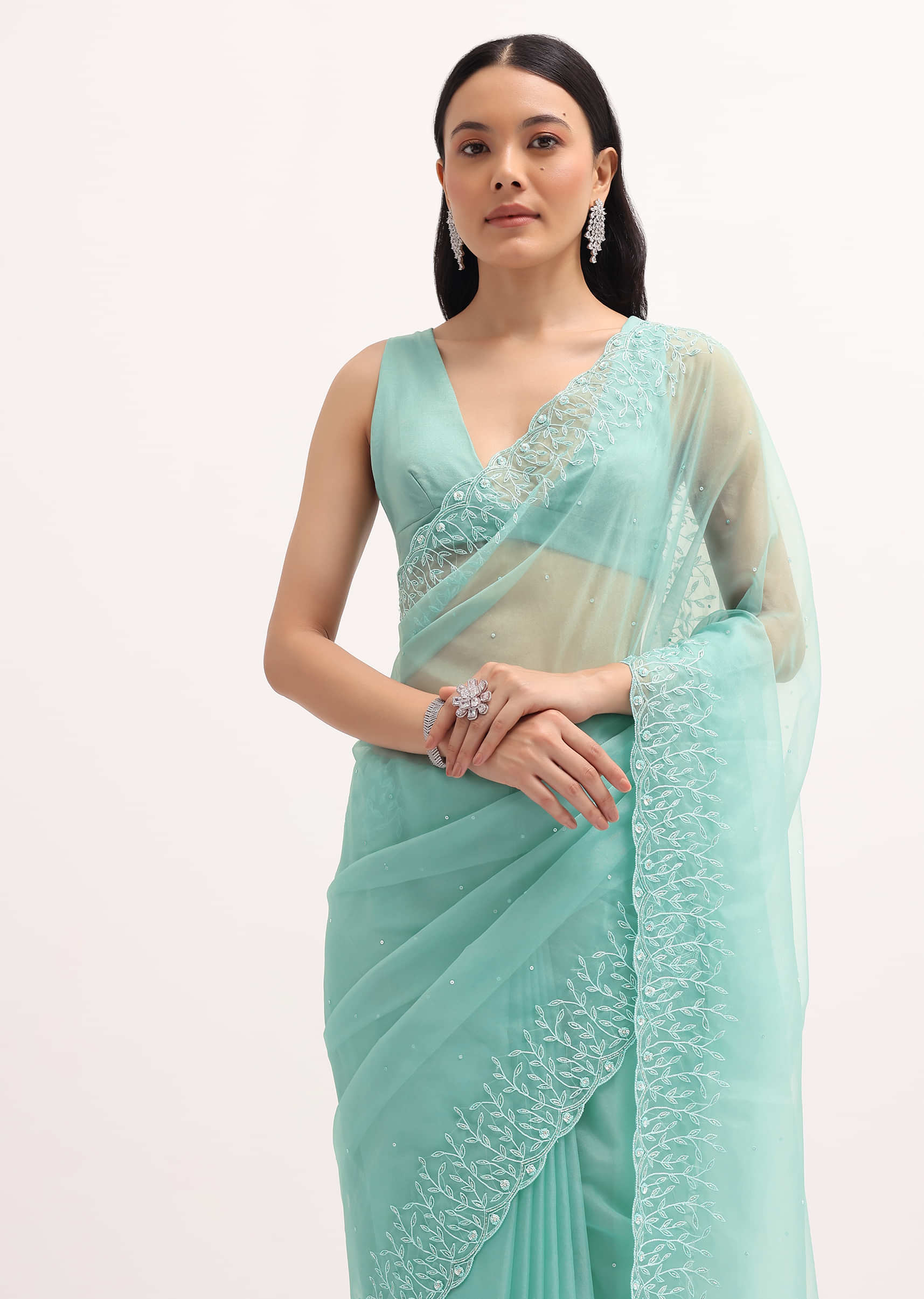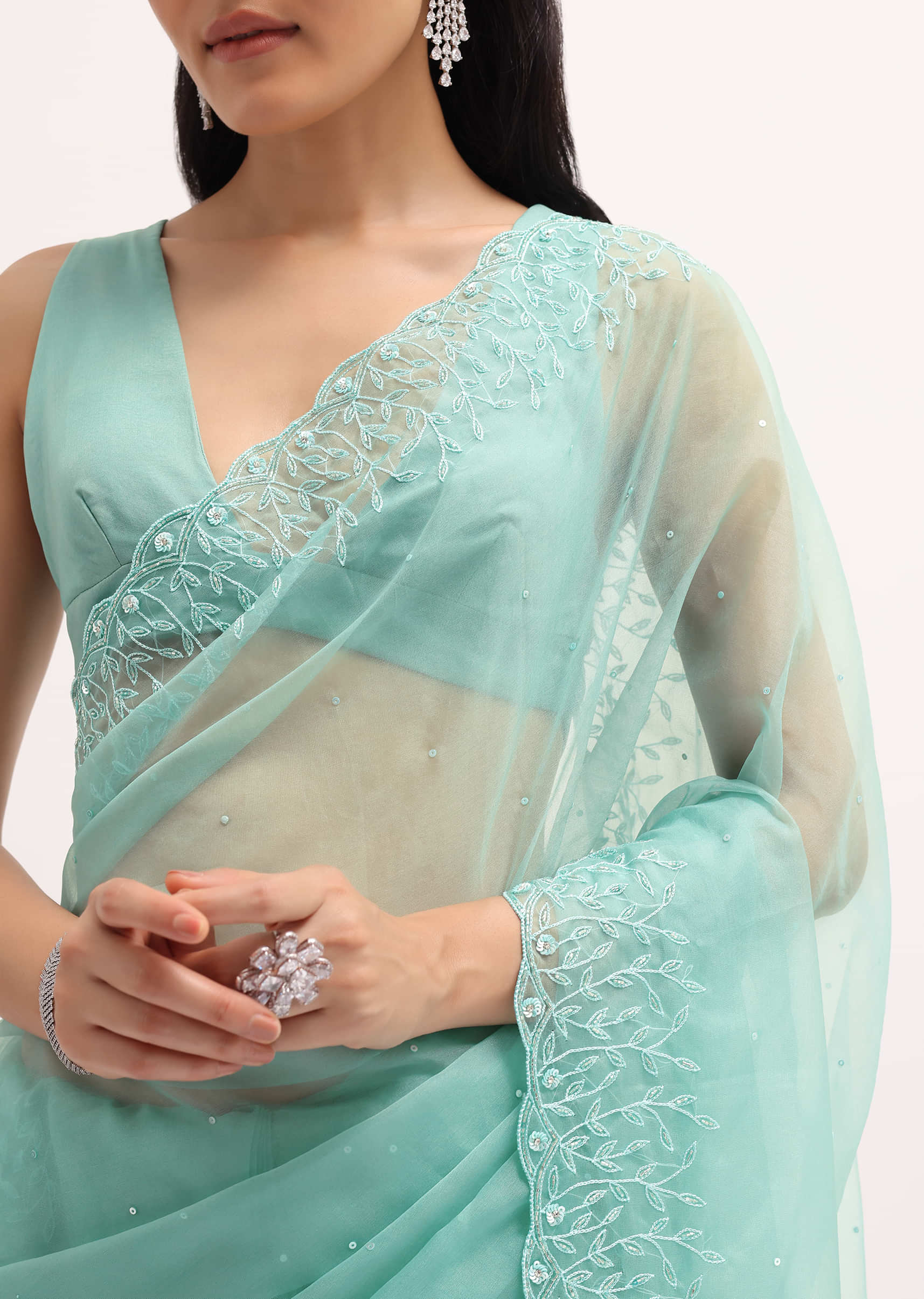 Aqua Blue Embroidered Organza Saree With Unstitched Blouse