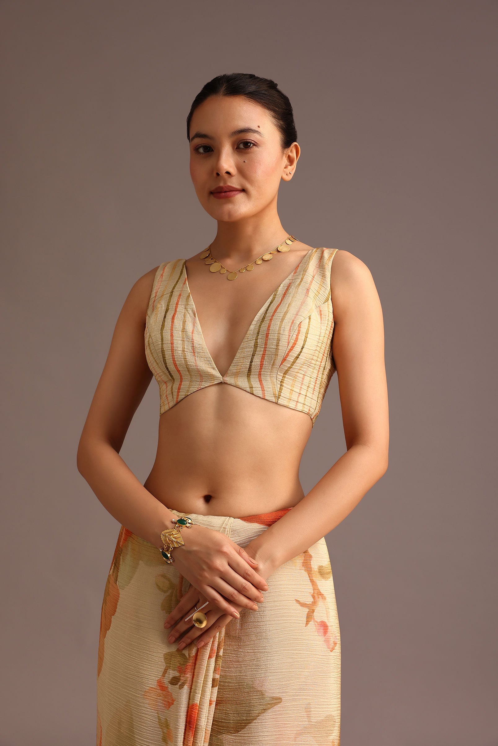 This beige crushed saree is made from soft, flowing fabric that gives a textured, graceful look. The saree features a delicate lace border along the pallu, adding an elegant touch to its abstract print. This saree offers a blend of comfort and style. Its subtle design and neutral tone make it versatile, ideal for both traditional and modern settings, allowing you to stand out while keeping it understated and chic. Awarded as the Most Trusted Brand, we're delivering styles you love, just as promised.