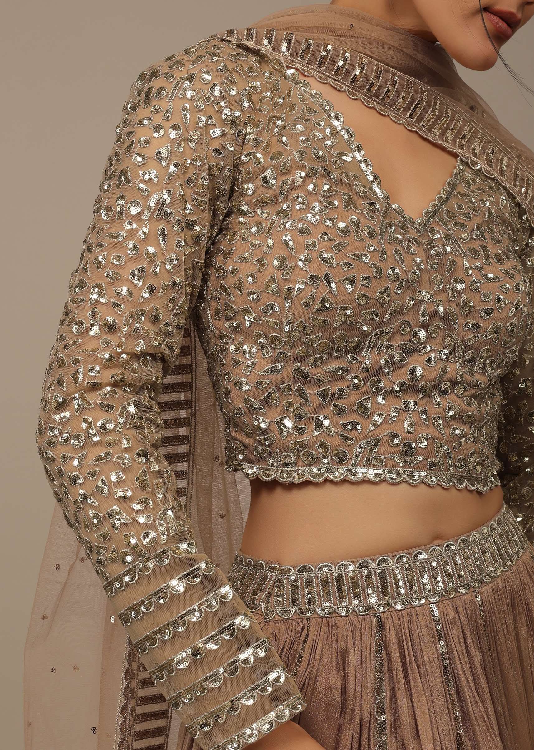 - The padded net blouse is fully adorned in sequins, has a V neckline, full sleeves, and is paired with a net dupatta.