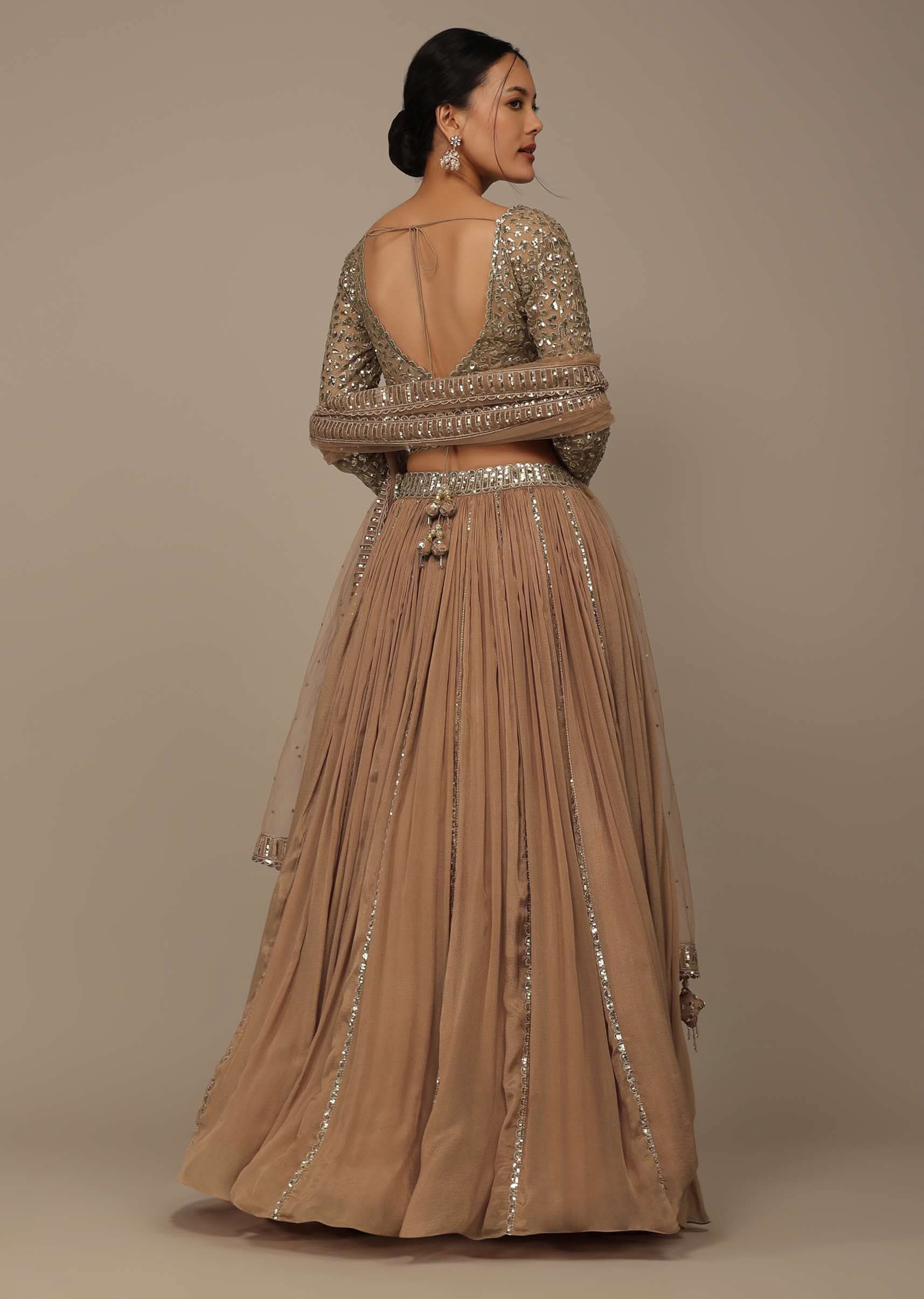 Beige Festive Sequins And Zari Embroidered Lehenga Set In Chinon