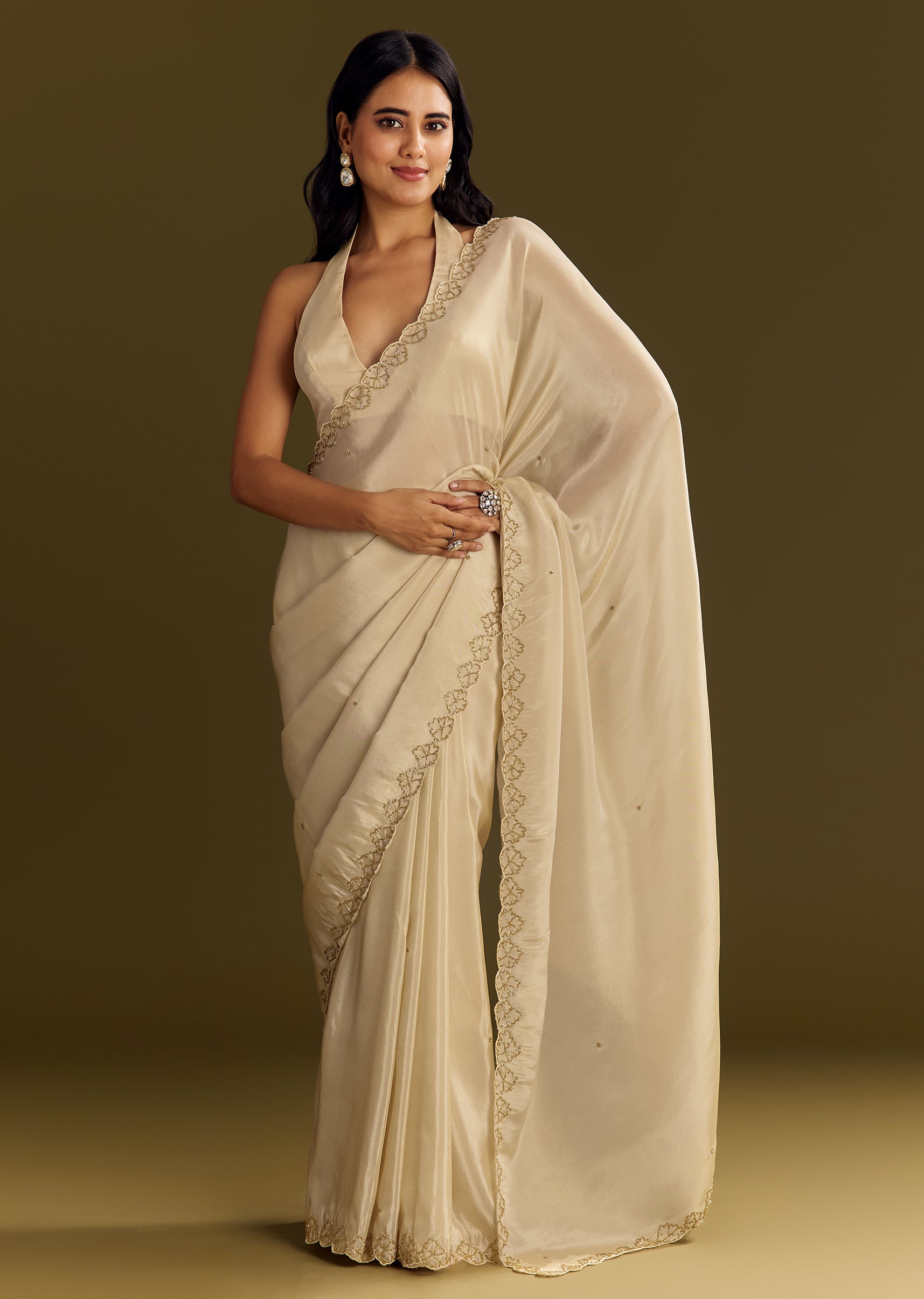 Beige Tissue Saree With Cutdana And Beads Scallop Border