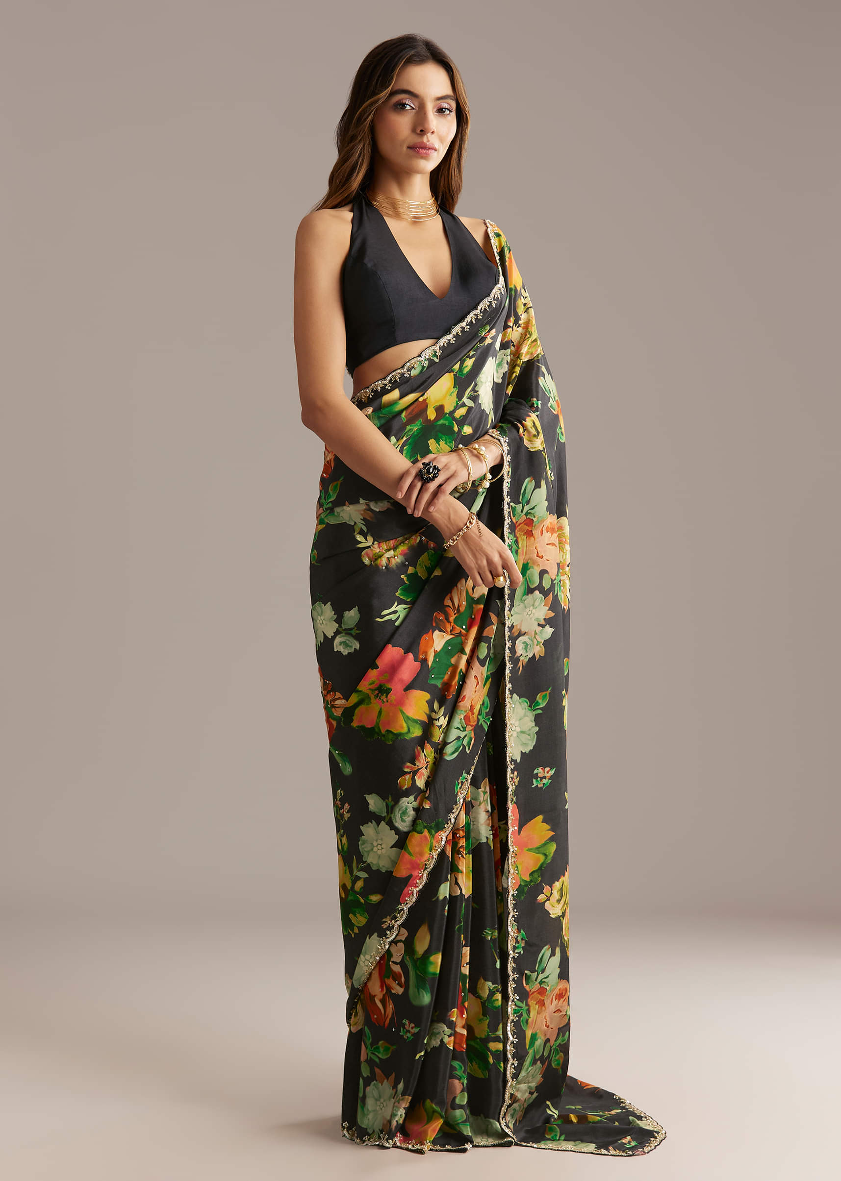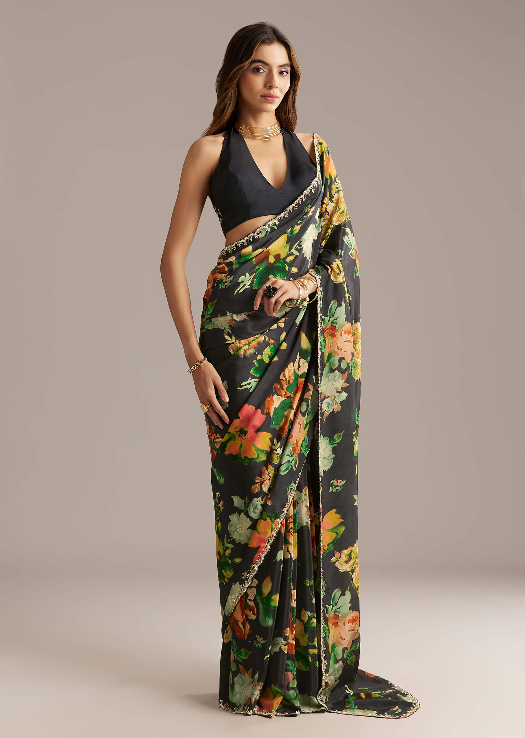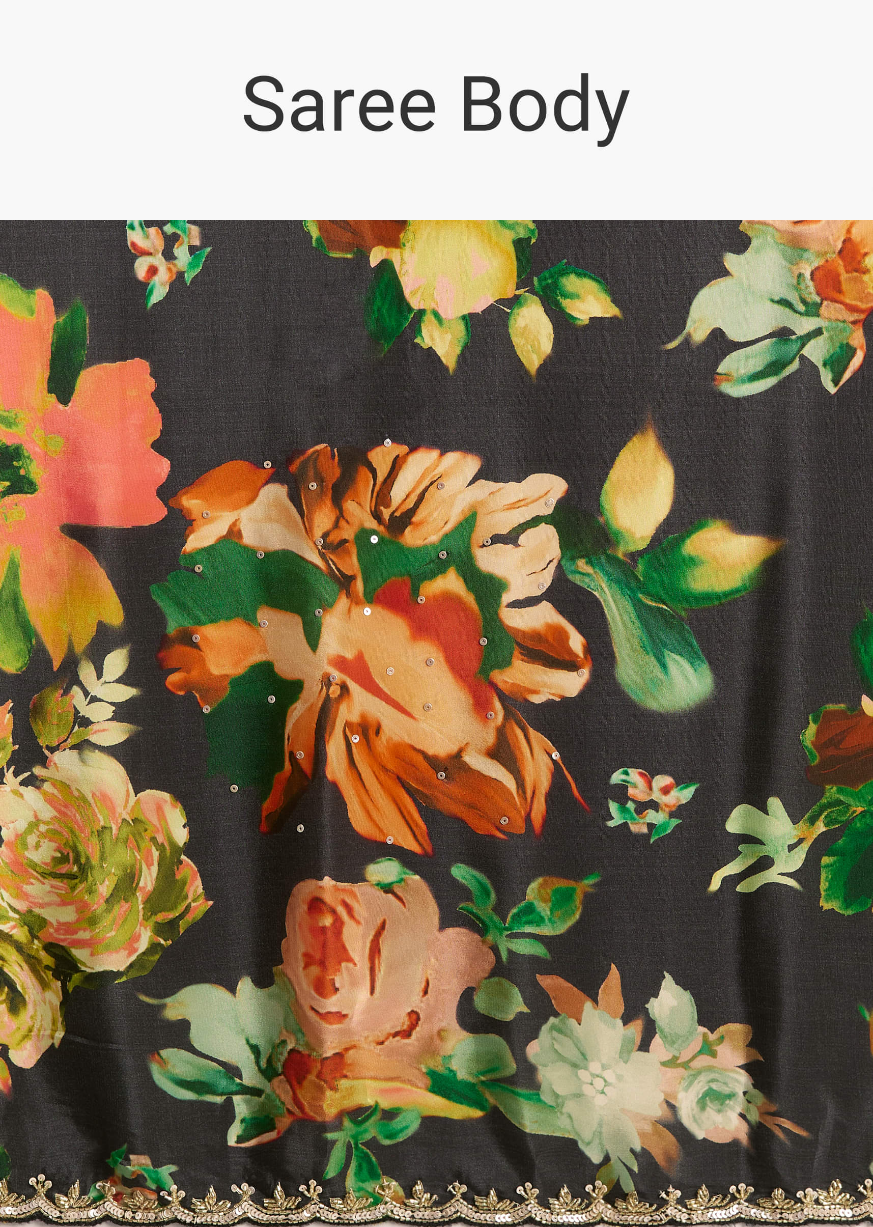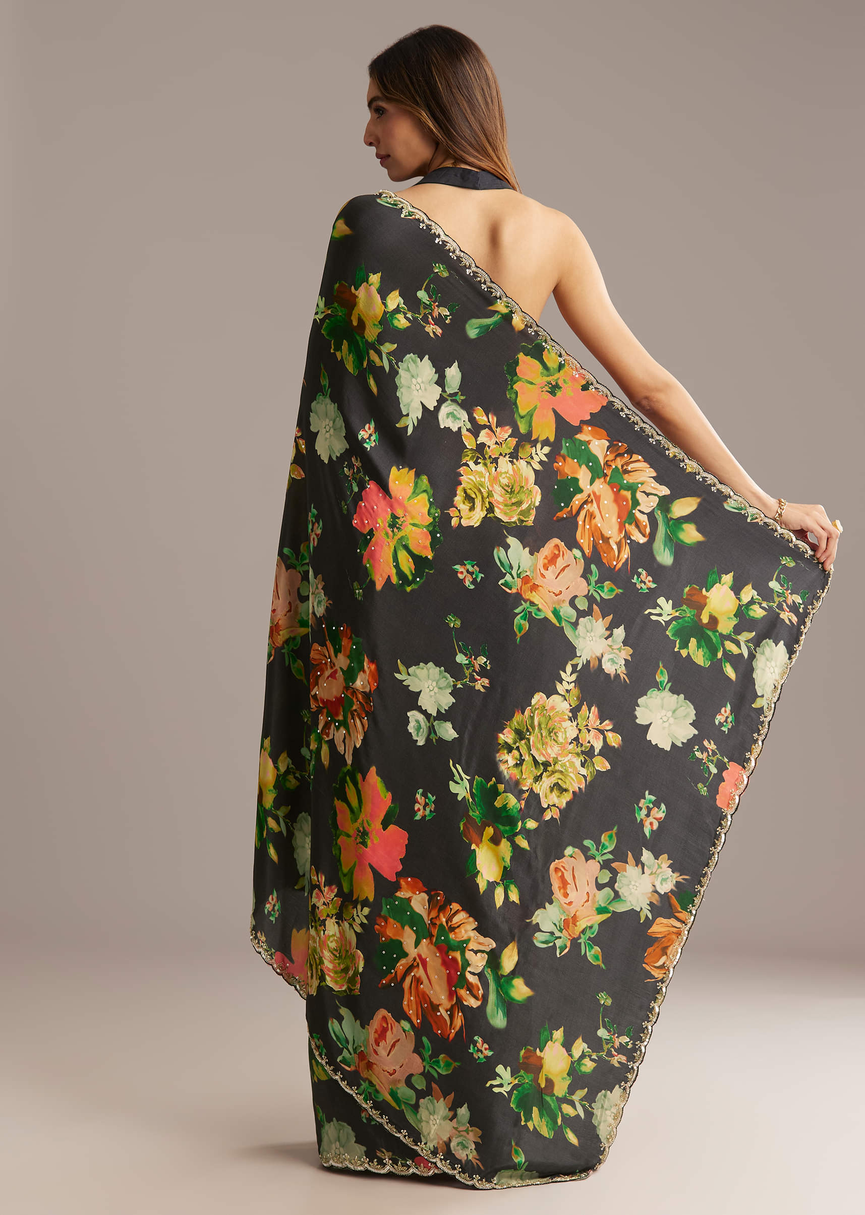 Black Crepe Saree With Floral Print And Stone Embroidery
