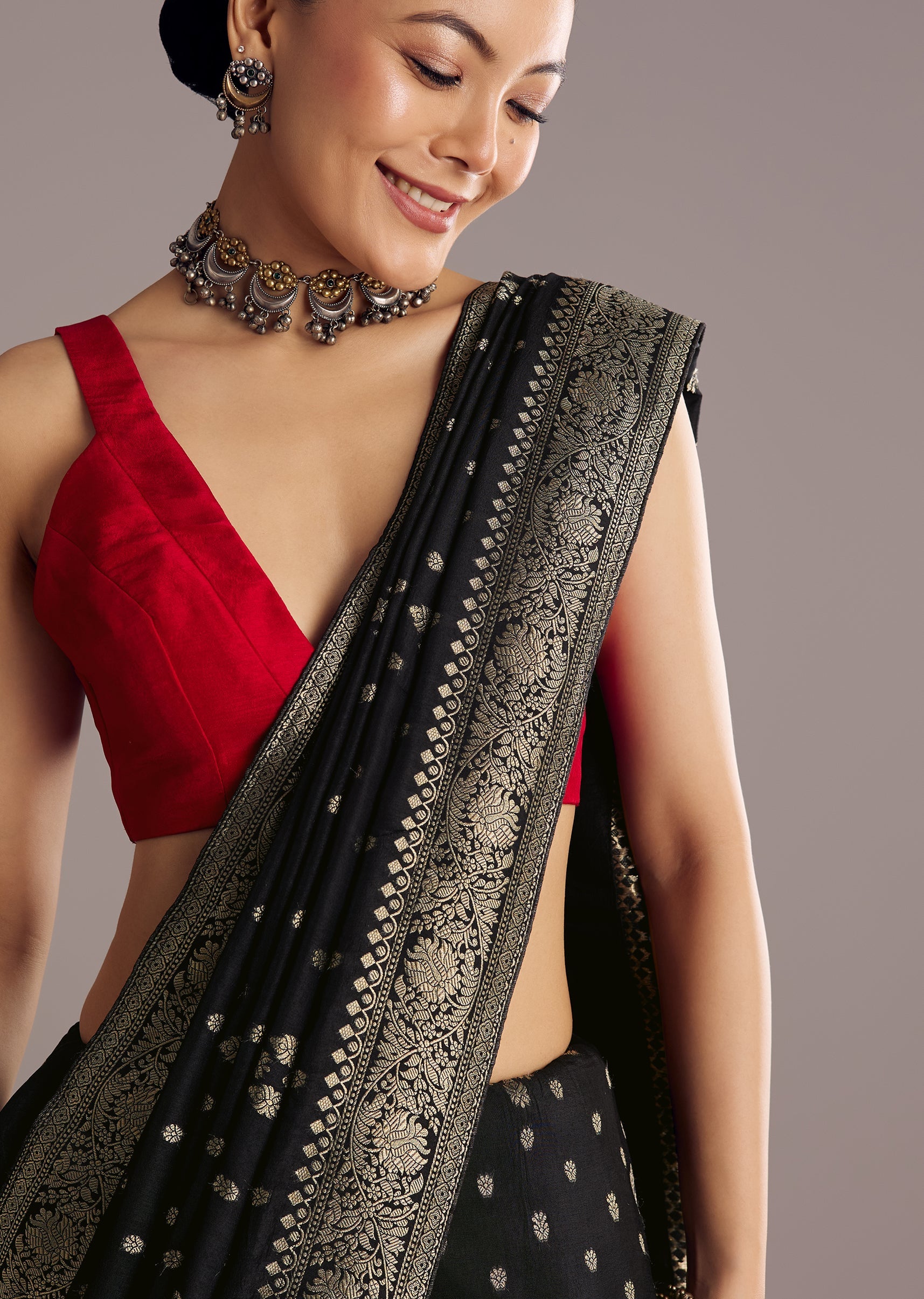 Classic and captivating, this black Dola silk saree is crafted with all over woven buttis in a luxurious brocade weave. Its rich texture and timeless elegance make it perfect for weddings, festive poojas, or family gatherings, ideal for the woman who wants to stand out with understated grace. Saree border and saree tassels may vary. Blouse design or work may vary. Awarded as the Most Trusted Brand, we're delivering styles you love, just as promised.