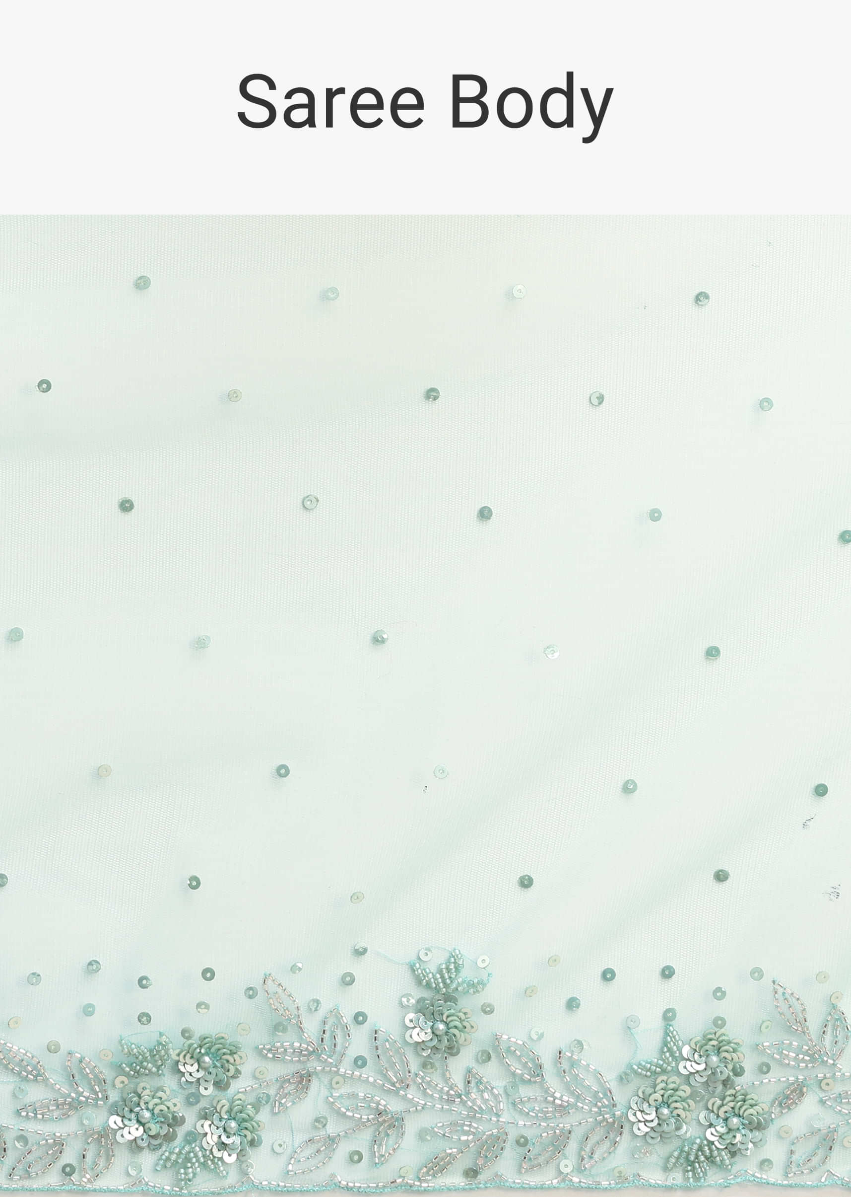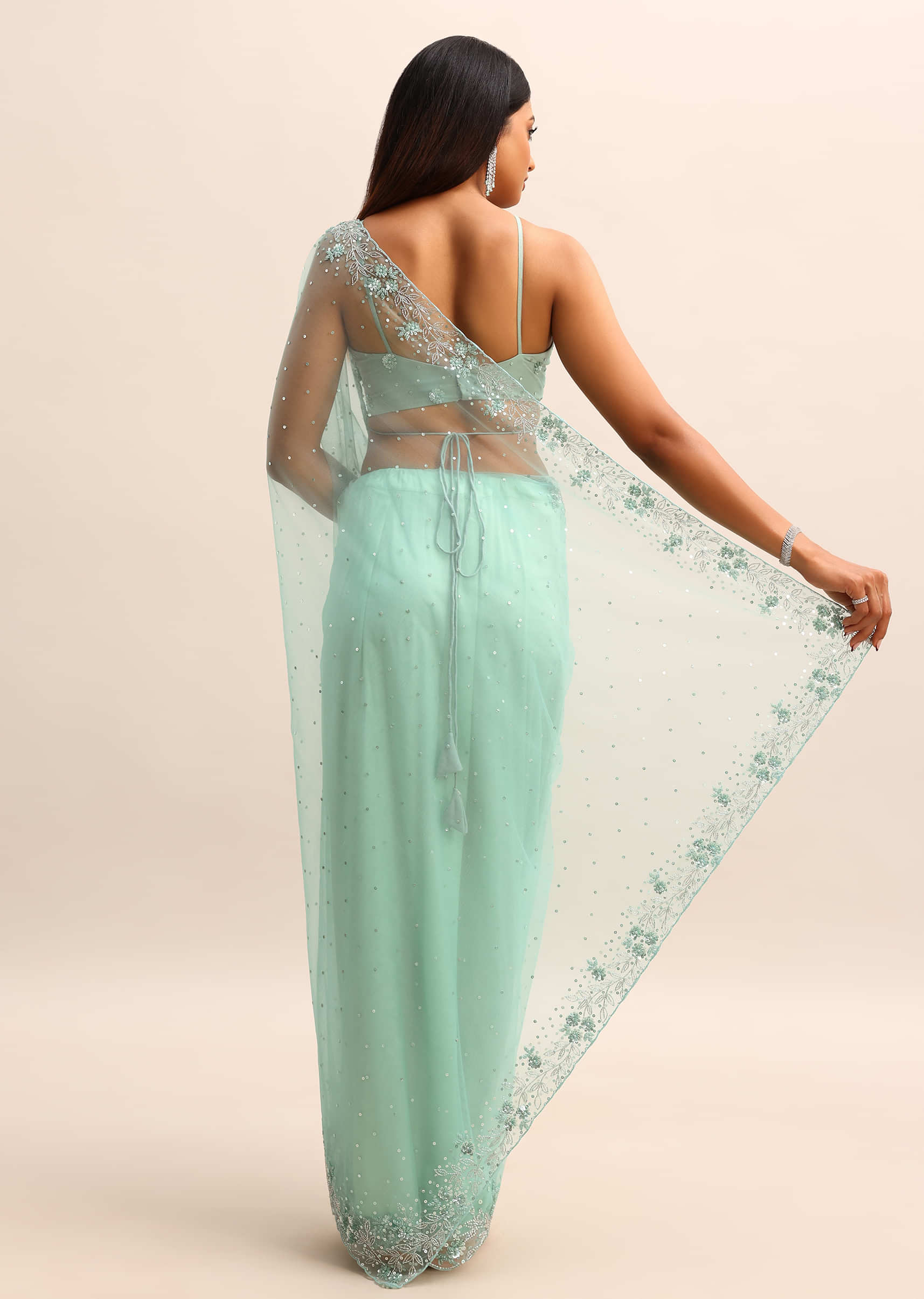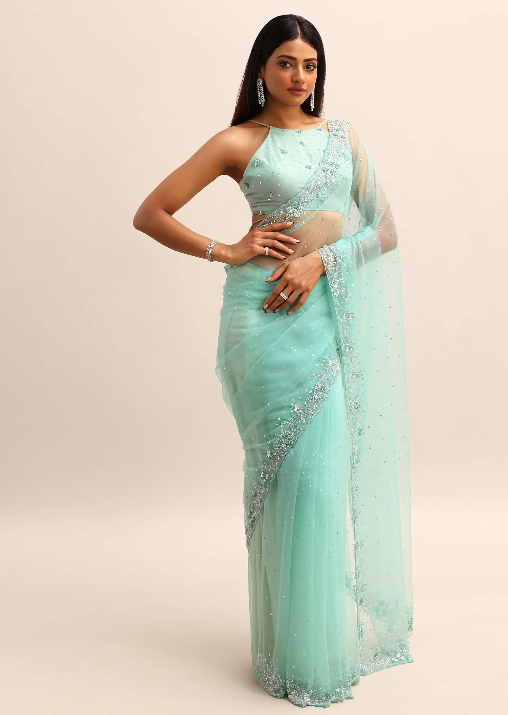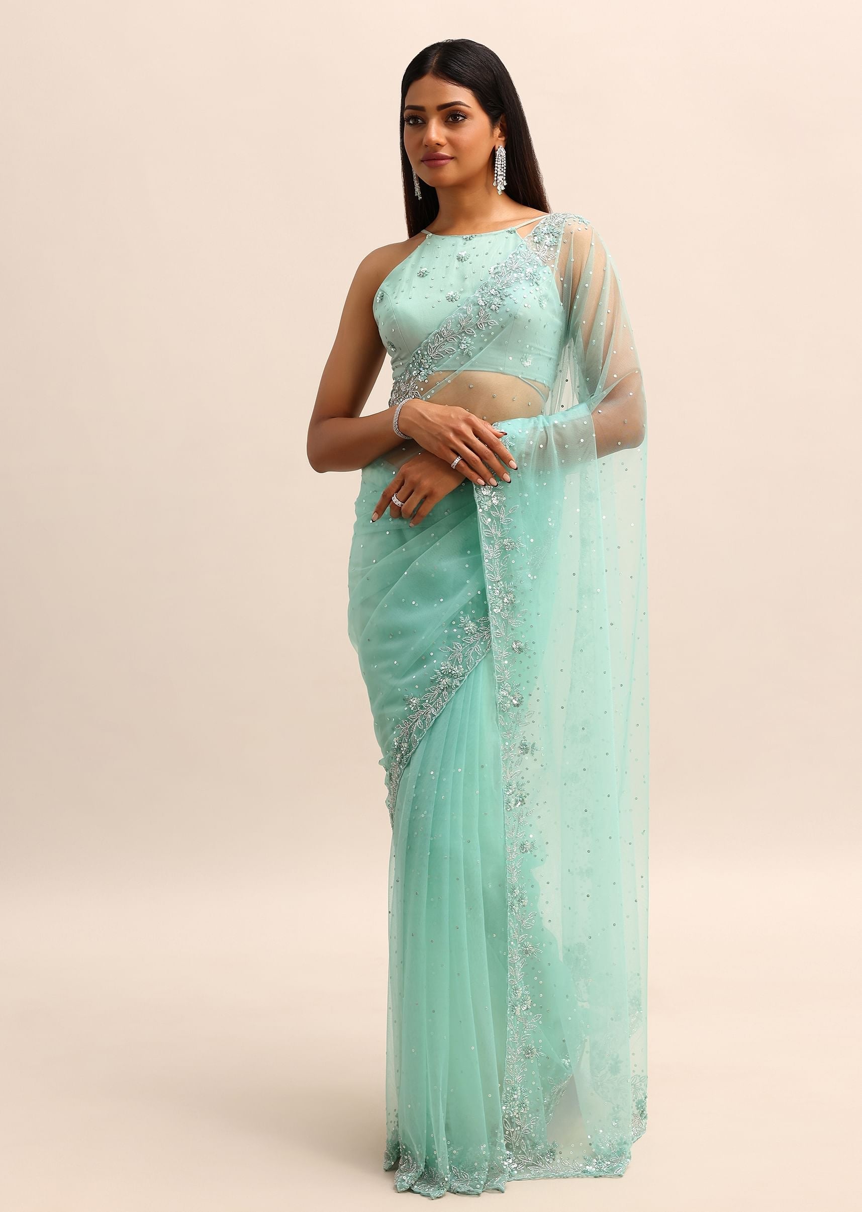 - This blue embroidered net saree shimmers with intricate threadwork a constellation of beauty dancing on a canvas of air.