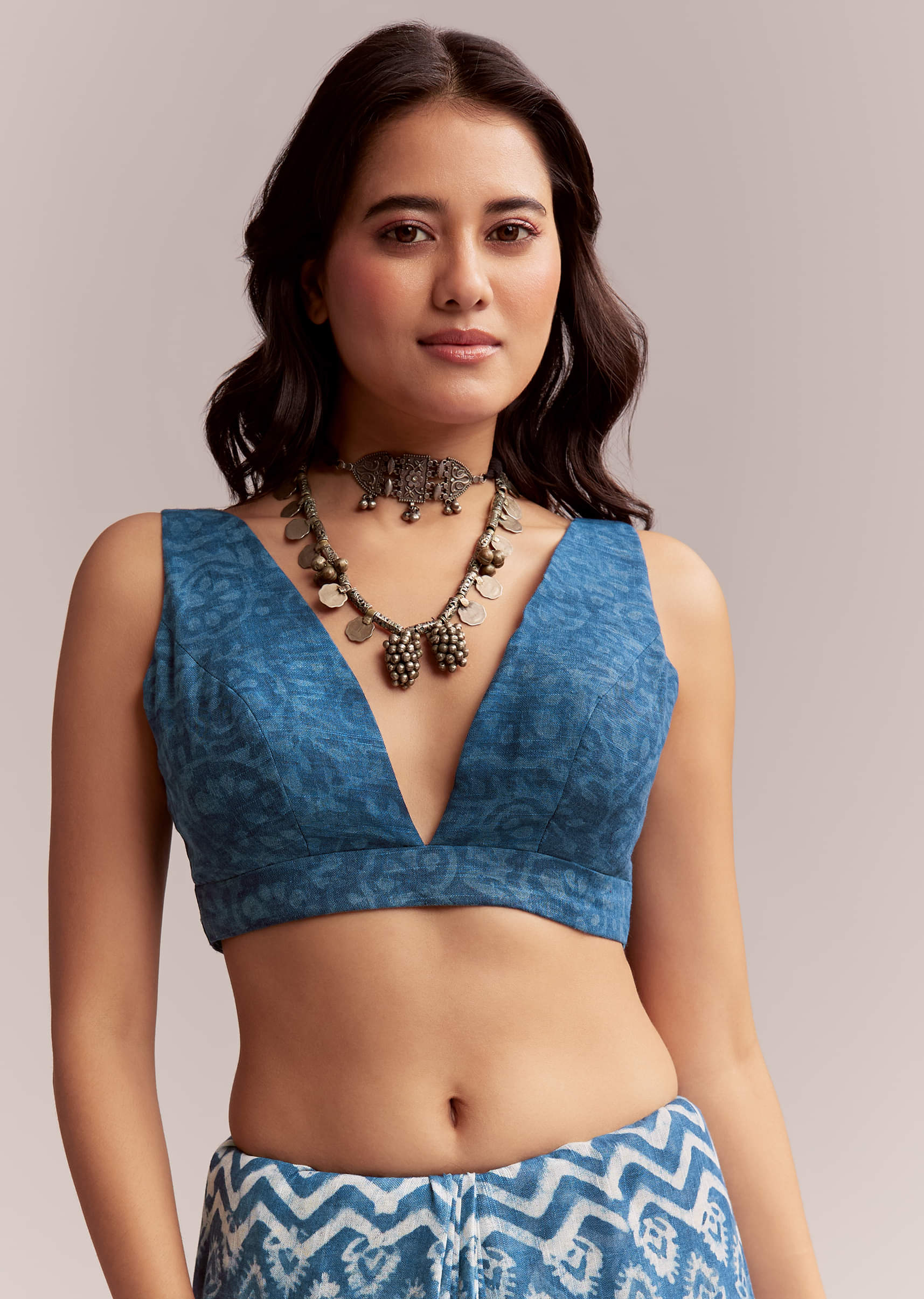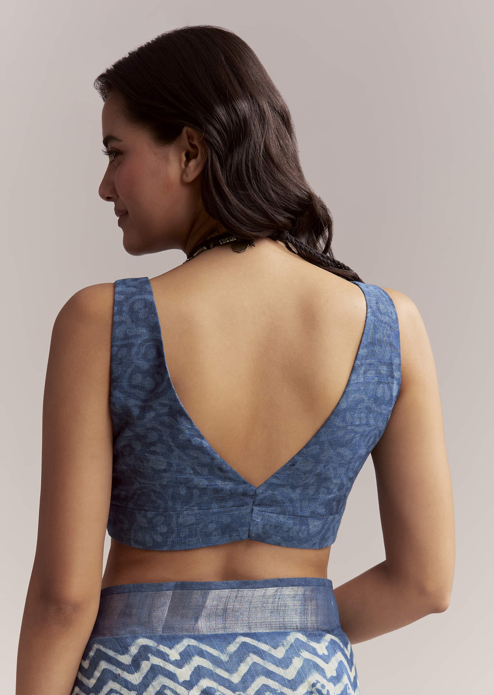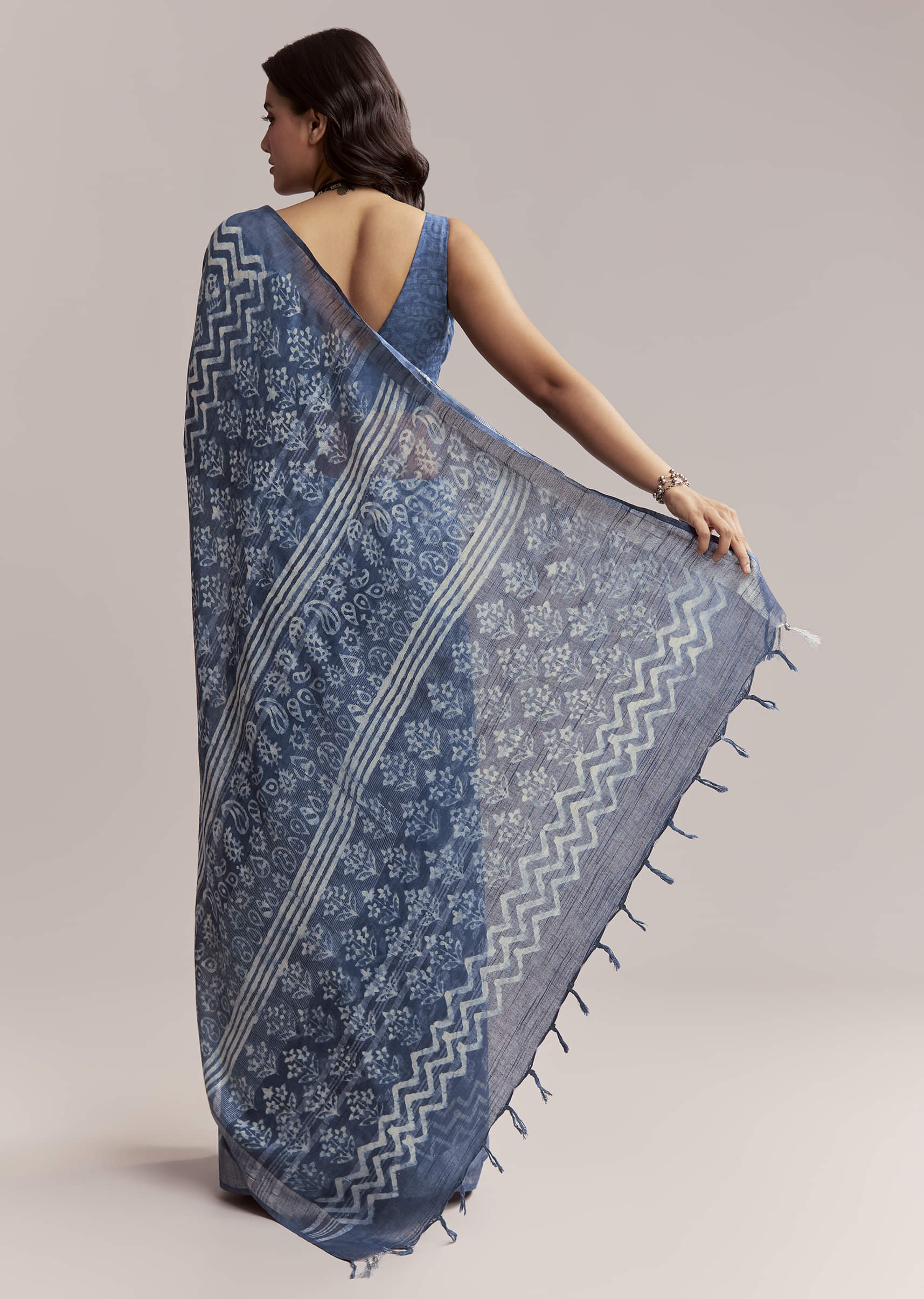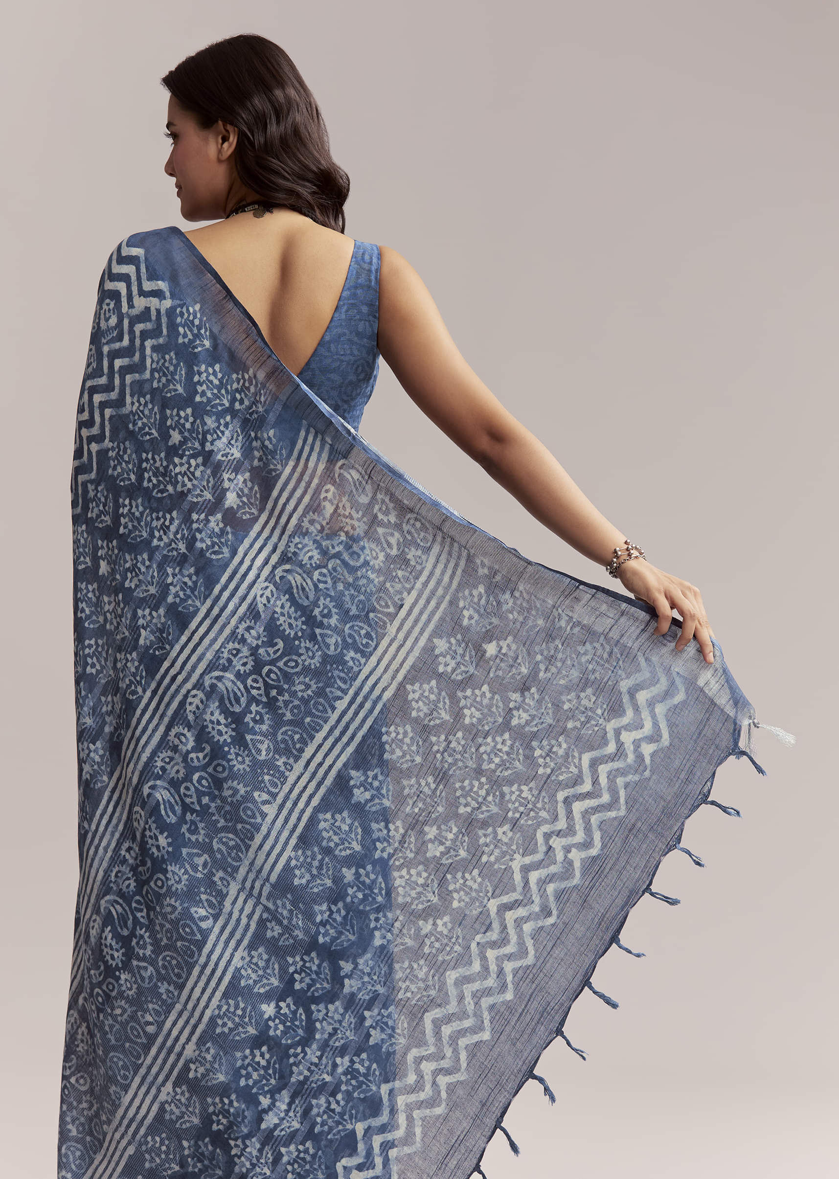 Blue Linen Printed Saree With Traditional Ajrakh Leaf Print