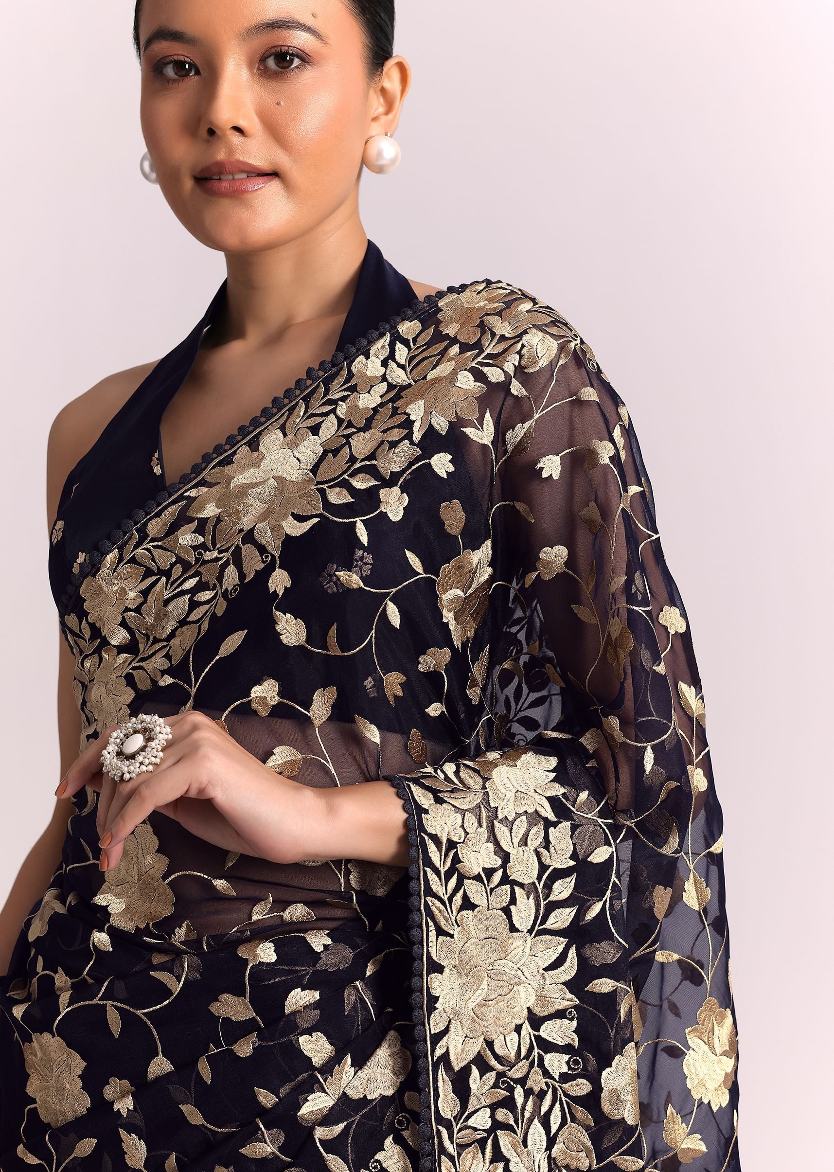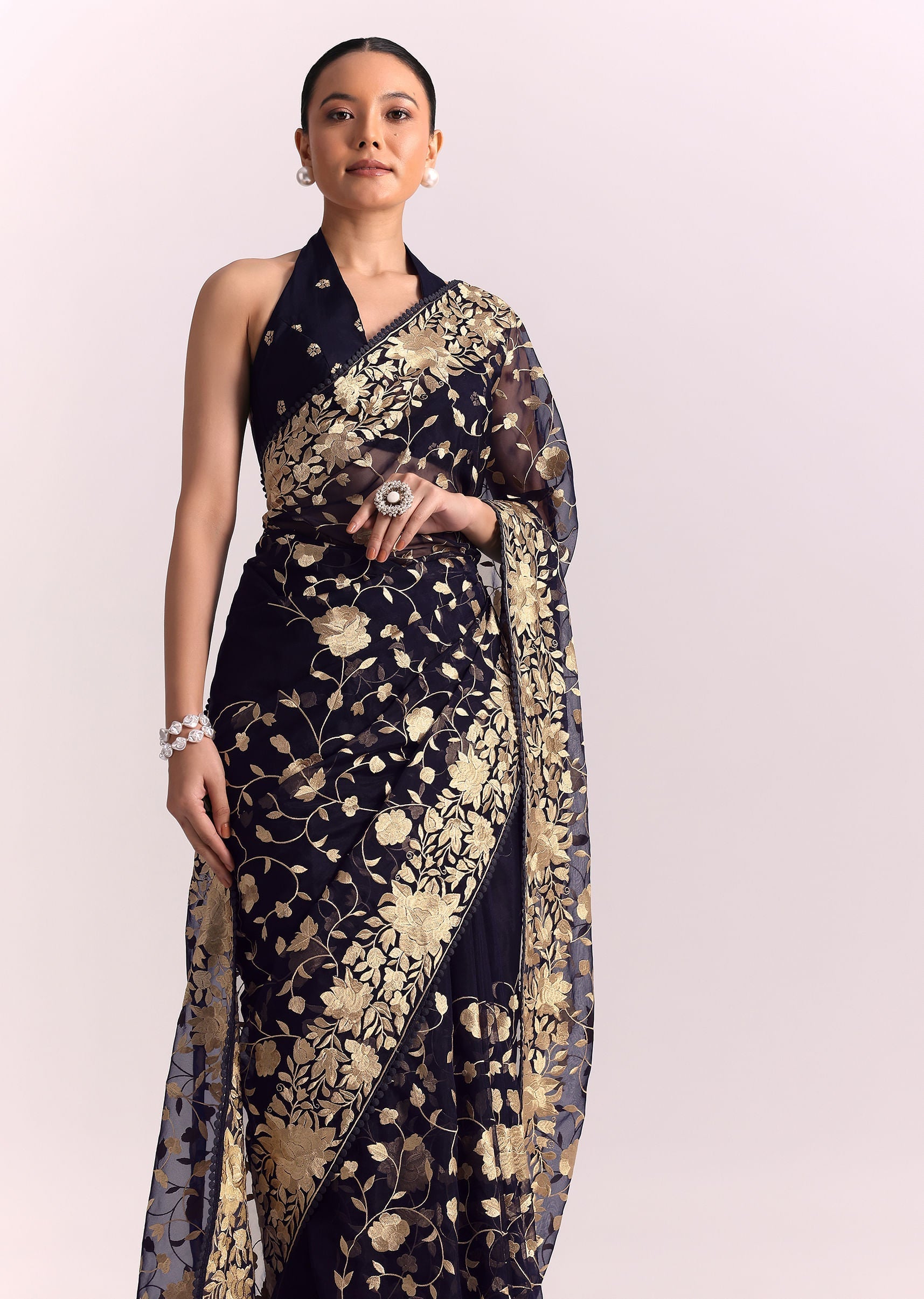 - Featuring detailed parsi gara embroidery in hues of gold that add a touch of opulence to its sensous silhouette.