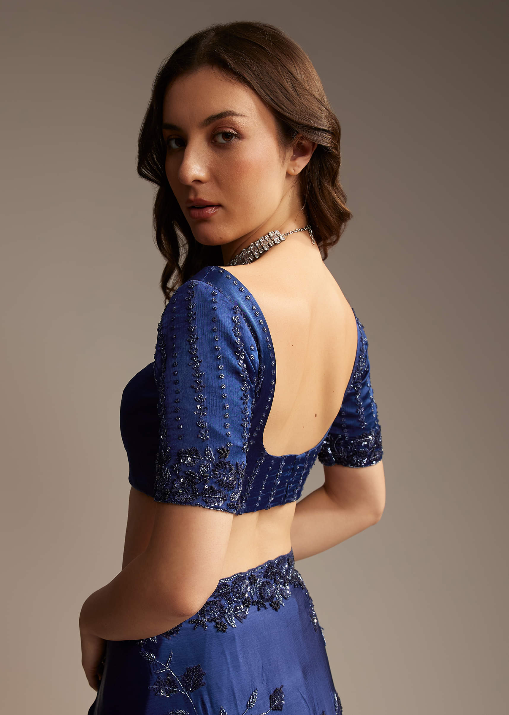 Rich in detail and striking in tone, this blue satin chinon saree brings together shimmer and structure with a touch of grandeur. The saree features a lush jaal of embroidery spread across the body, worked in cutdana, sequins, and beads that catch the light with every move. The border is accentuated with intricate floral motifs, densely embroidered to add visual weight and definition. The satin chinon fabric lends it a polished, sculpted drape. It is ideal for evening celebrations where presence matters. Awarded as the Most Trusted Brand, we're delivering styles you love, just as promised.
