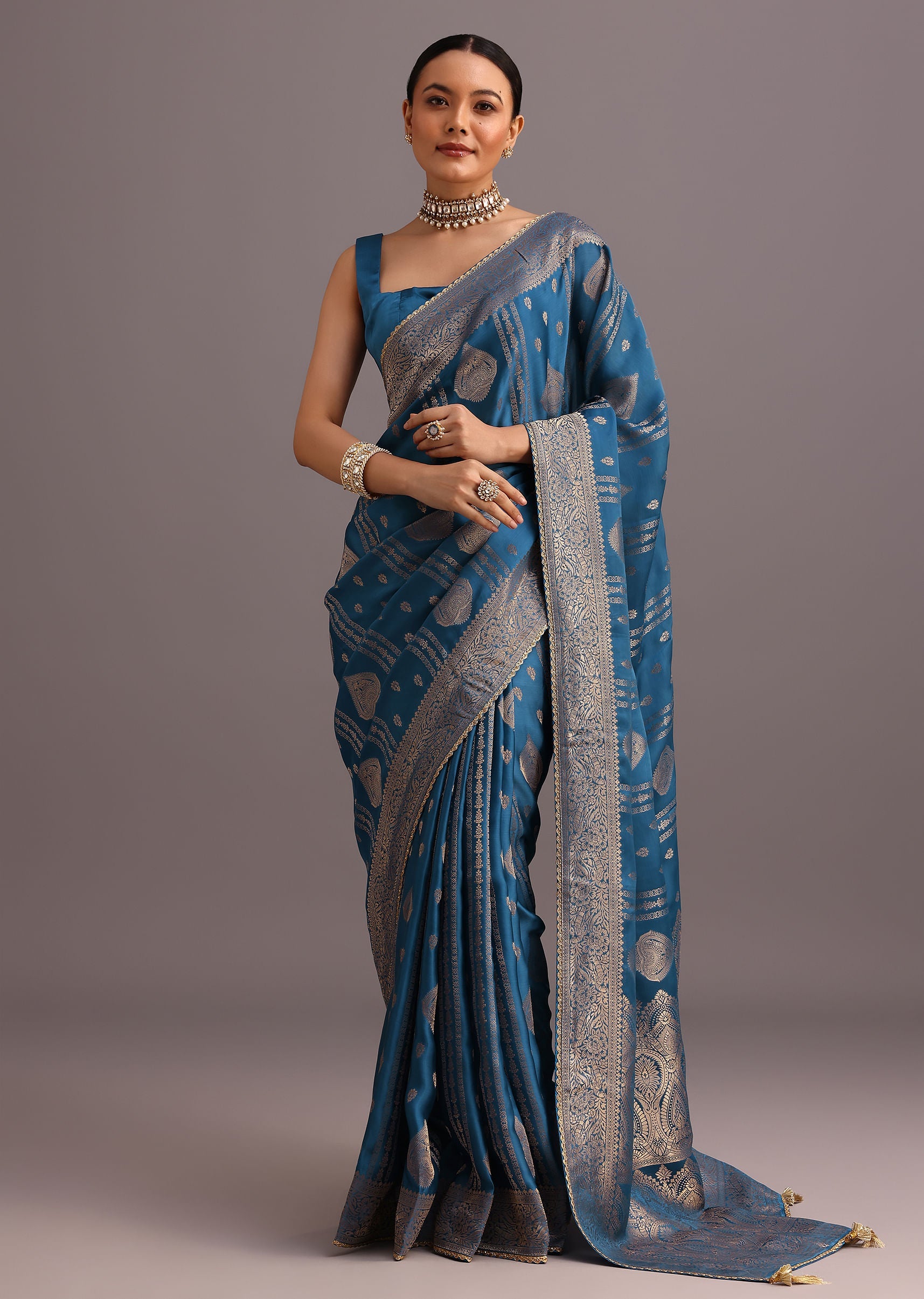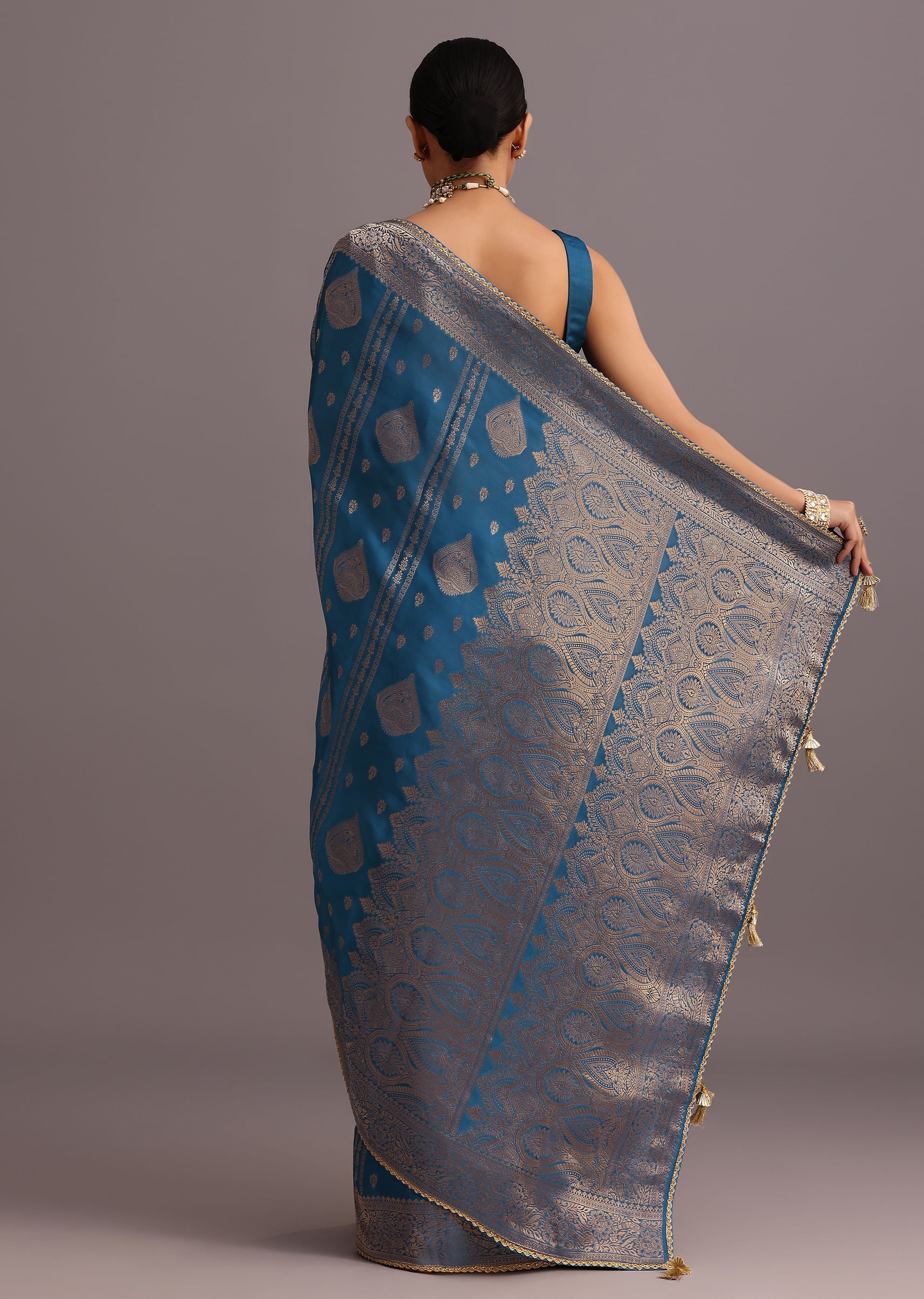 Blue Satin Silk Zari Woven Saree With Brocade Border