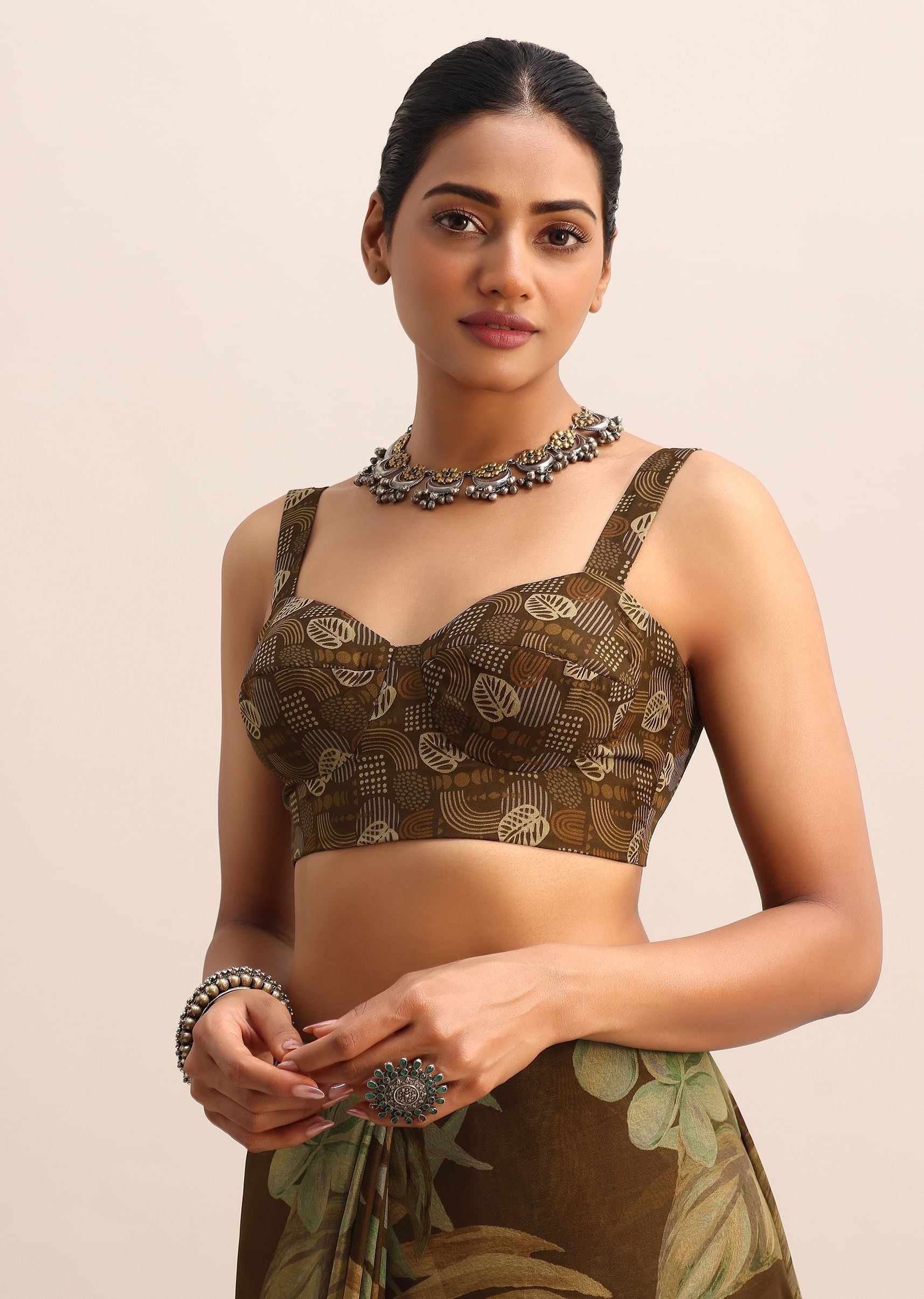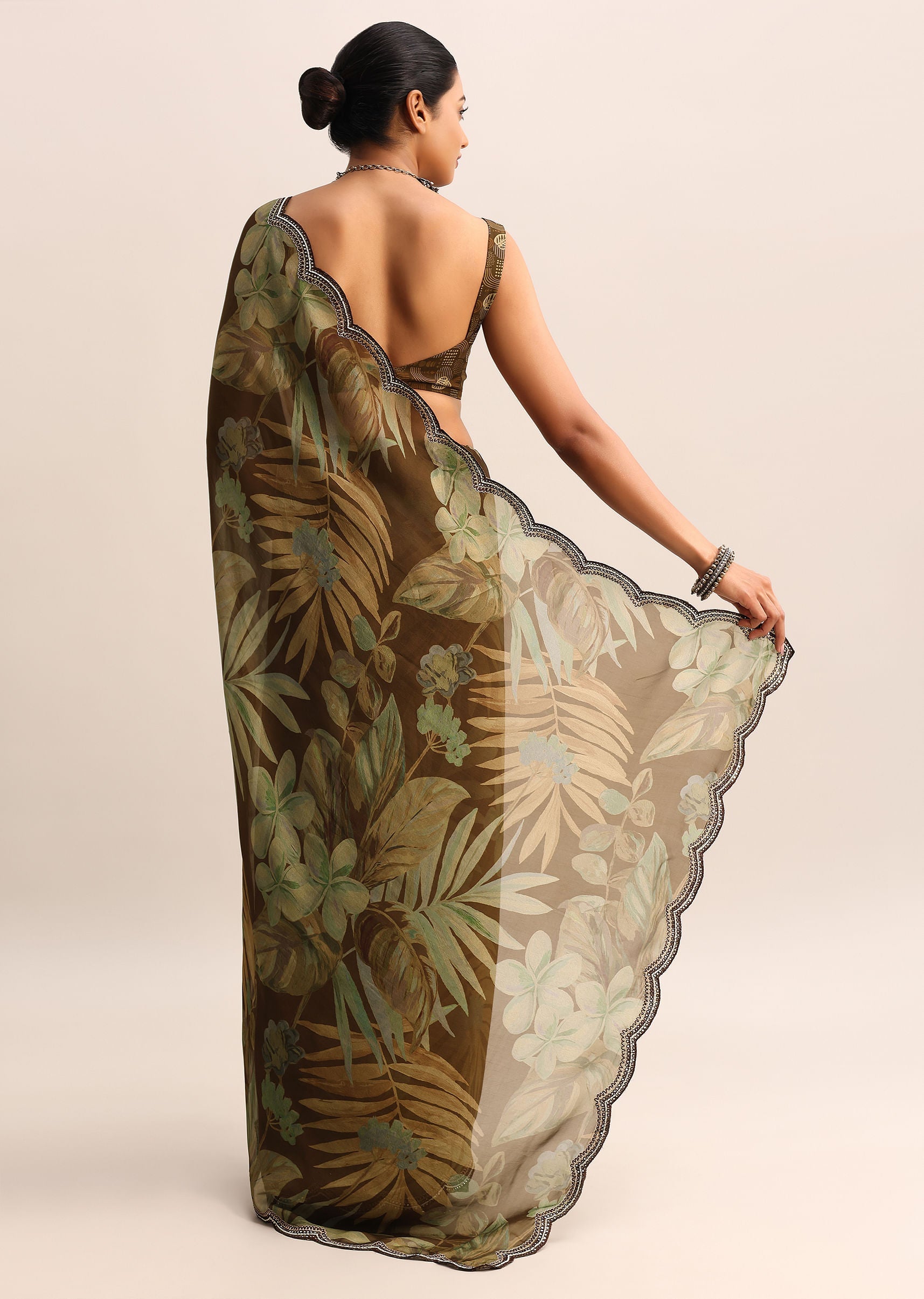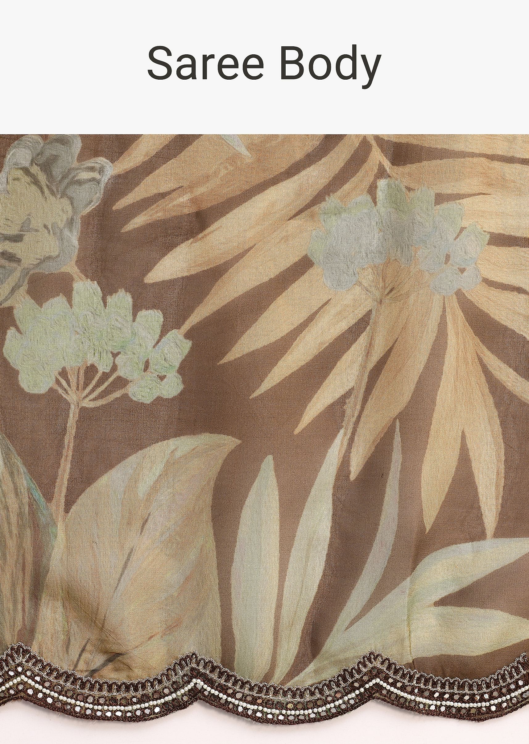 Brown Leaf Printed Soft Organza Saree With Embroidered Border