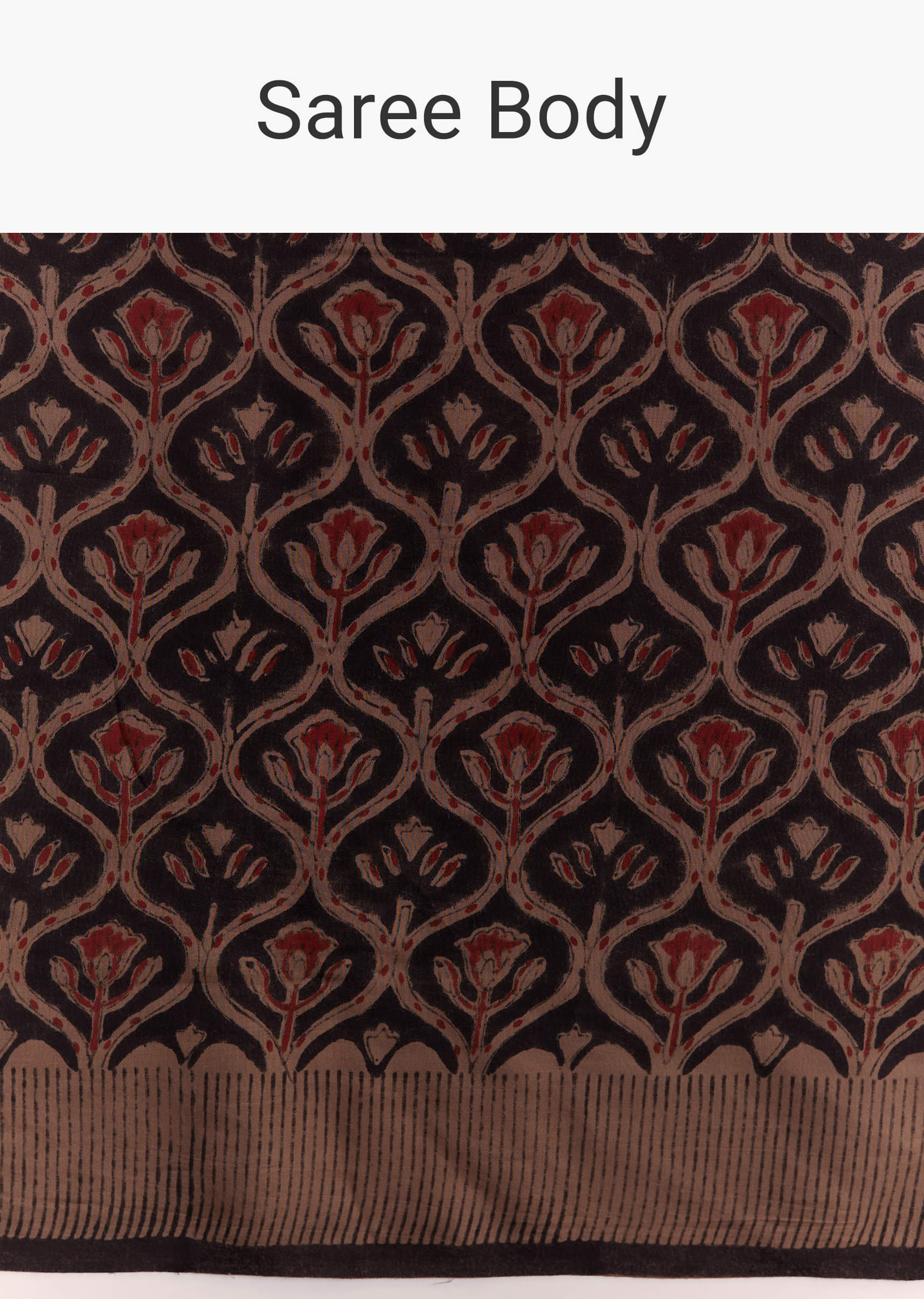 Dark Blue Linen Saree With Authentic Ajrakh Print And Golden Pallu