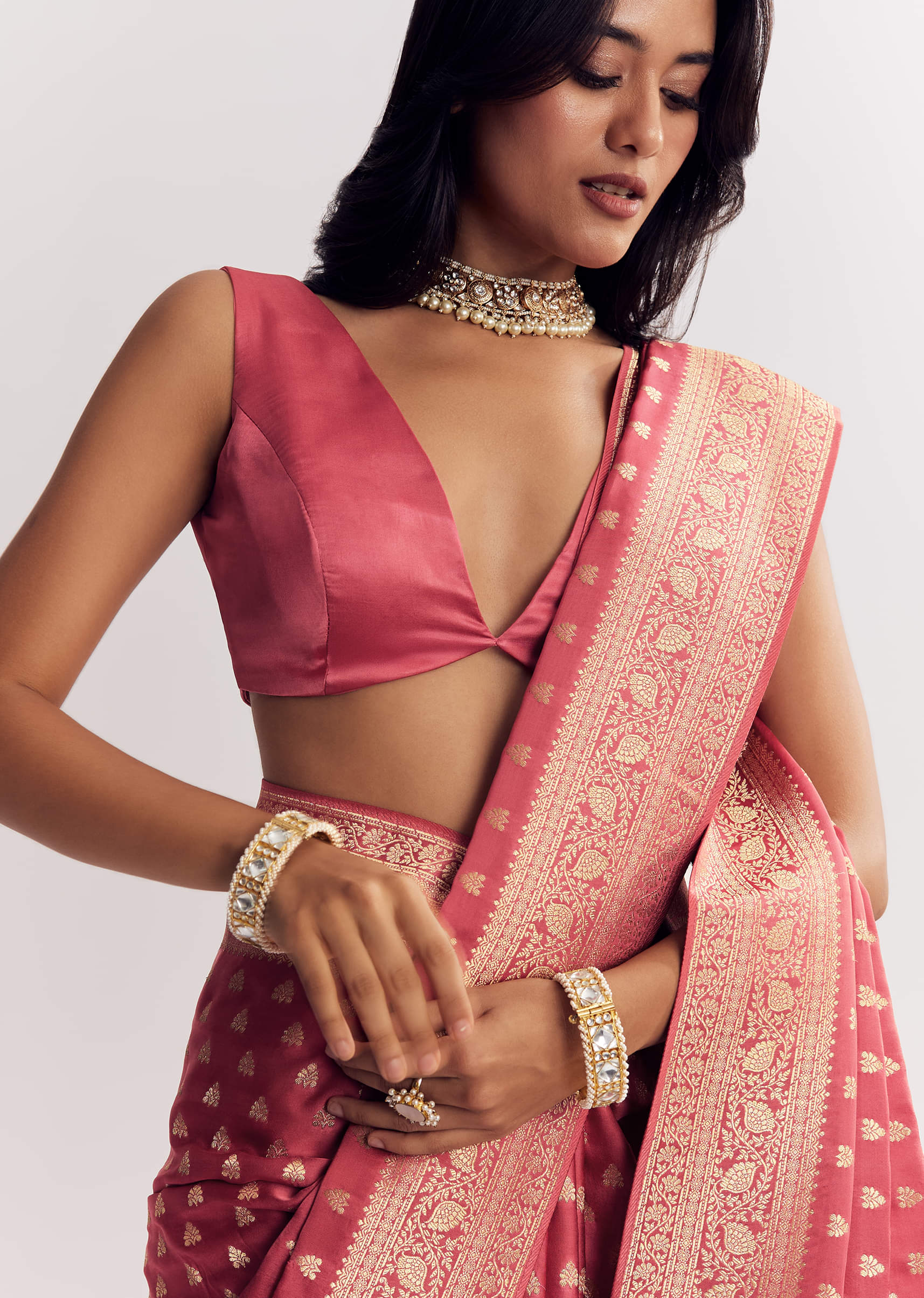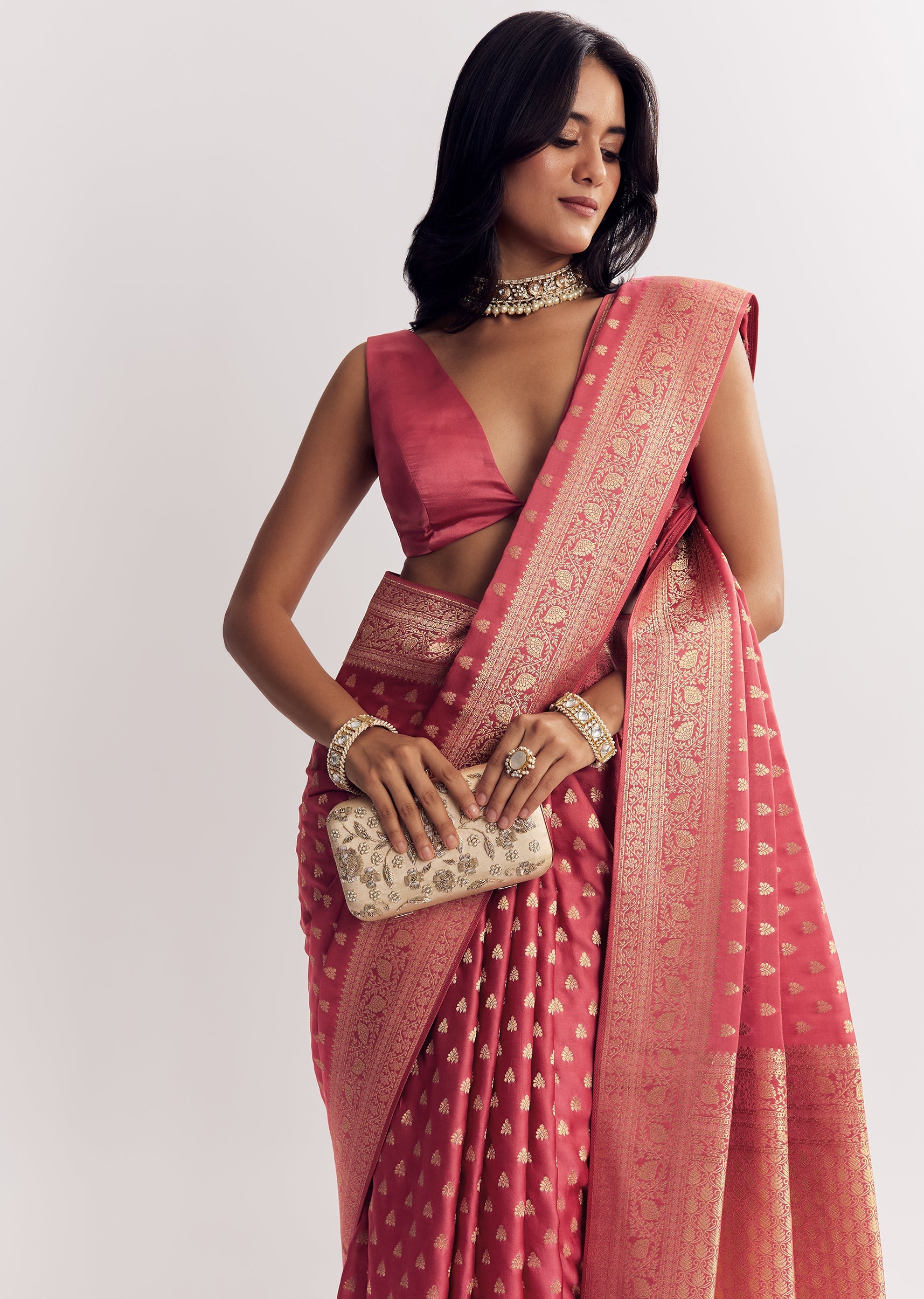 Soft and sophisticated, this dusky pink silk saree is sprinkled with butti and finished with a royal woven pallu and border. Awarded as the Most Trusted Brand, we're delivering styles you love, just as promised.