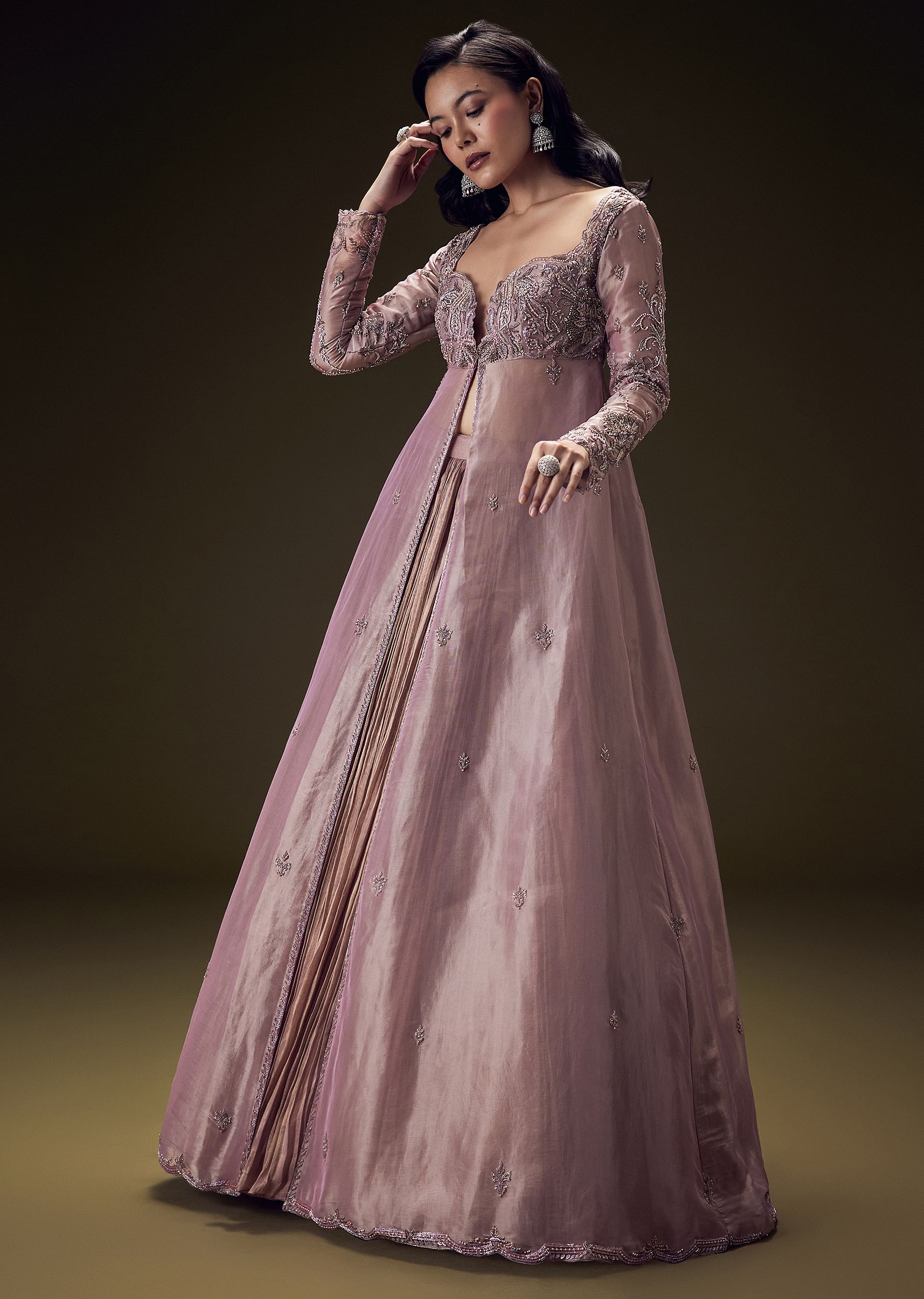 Dusty Lilac Embroidered Long Jacket With Ruched Lehenga