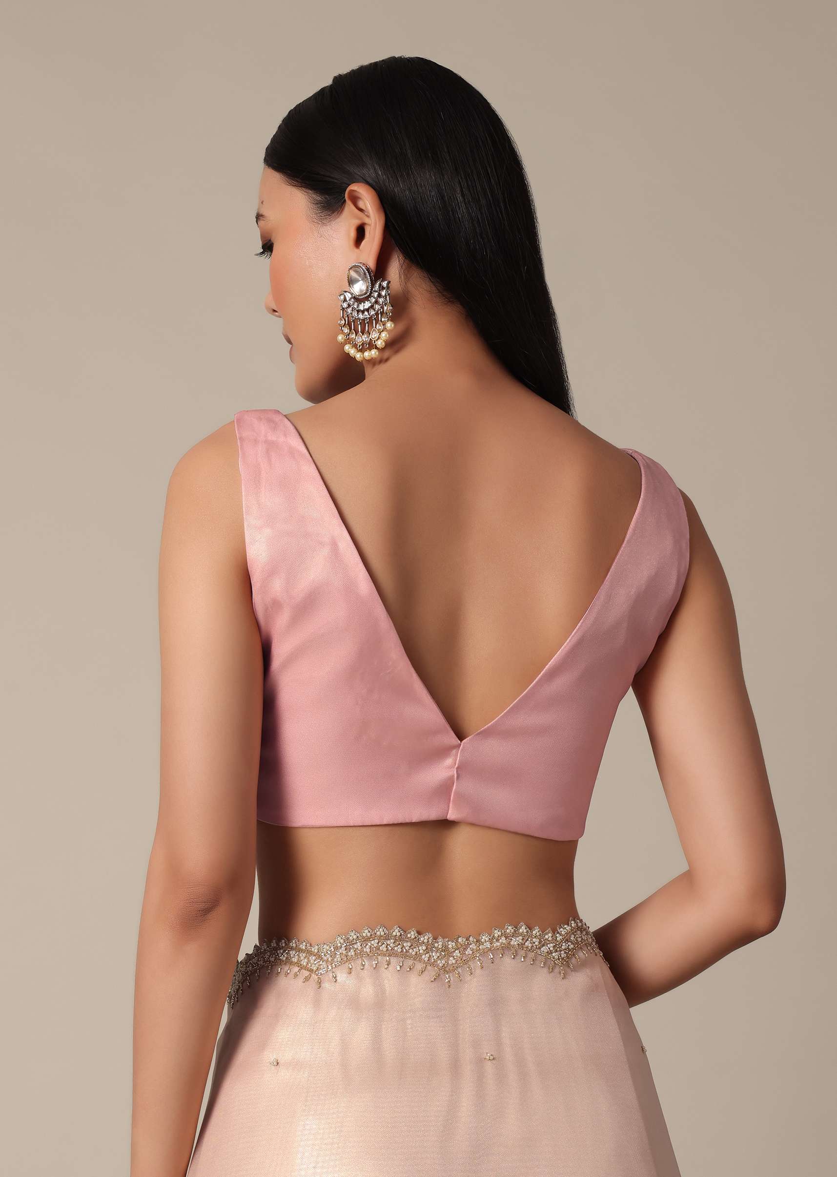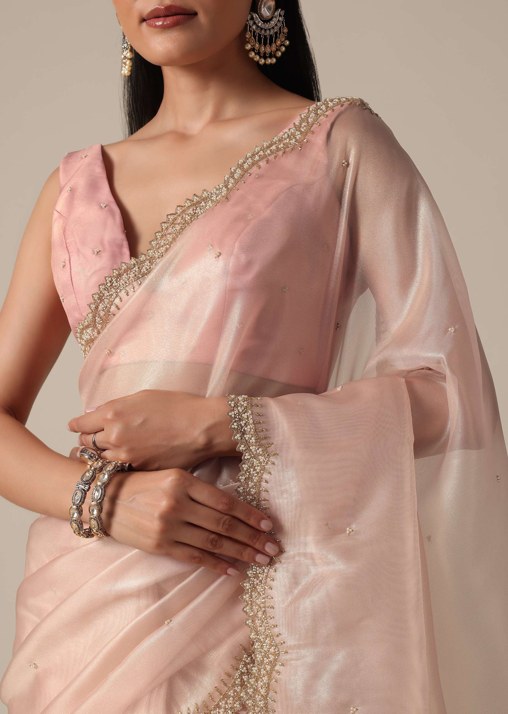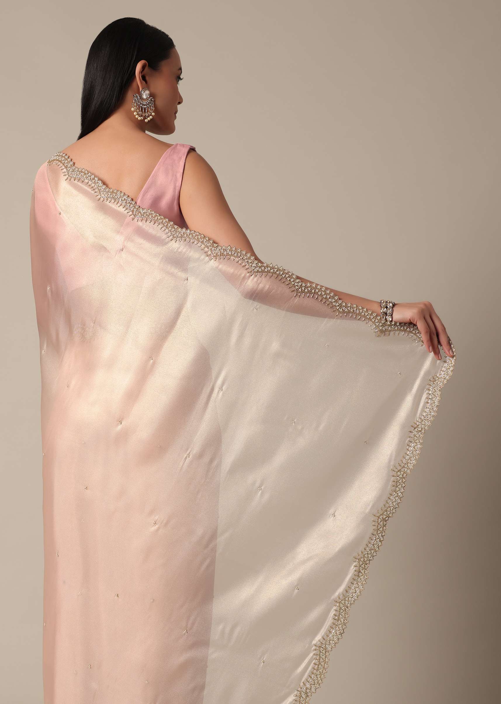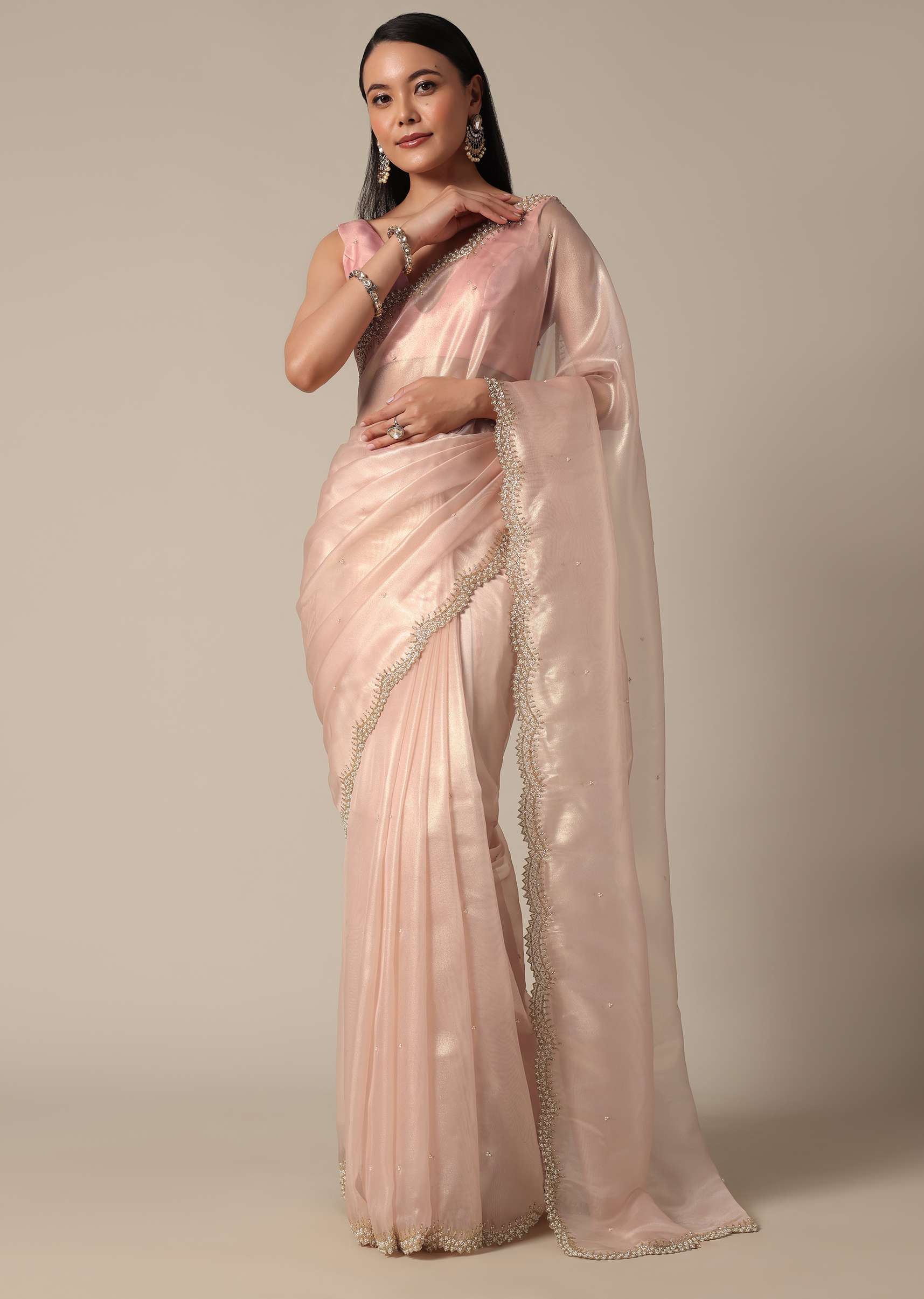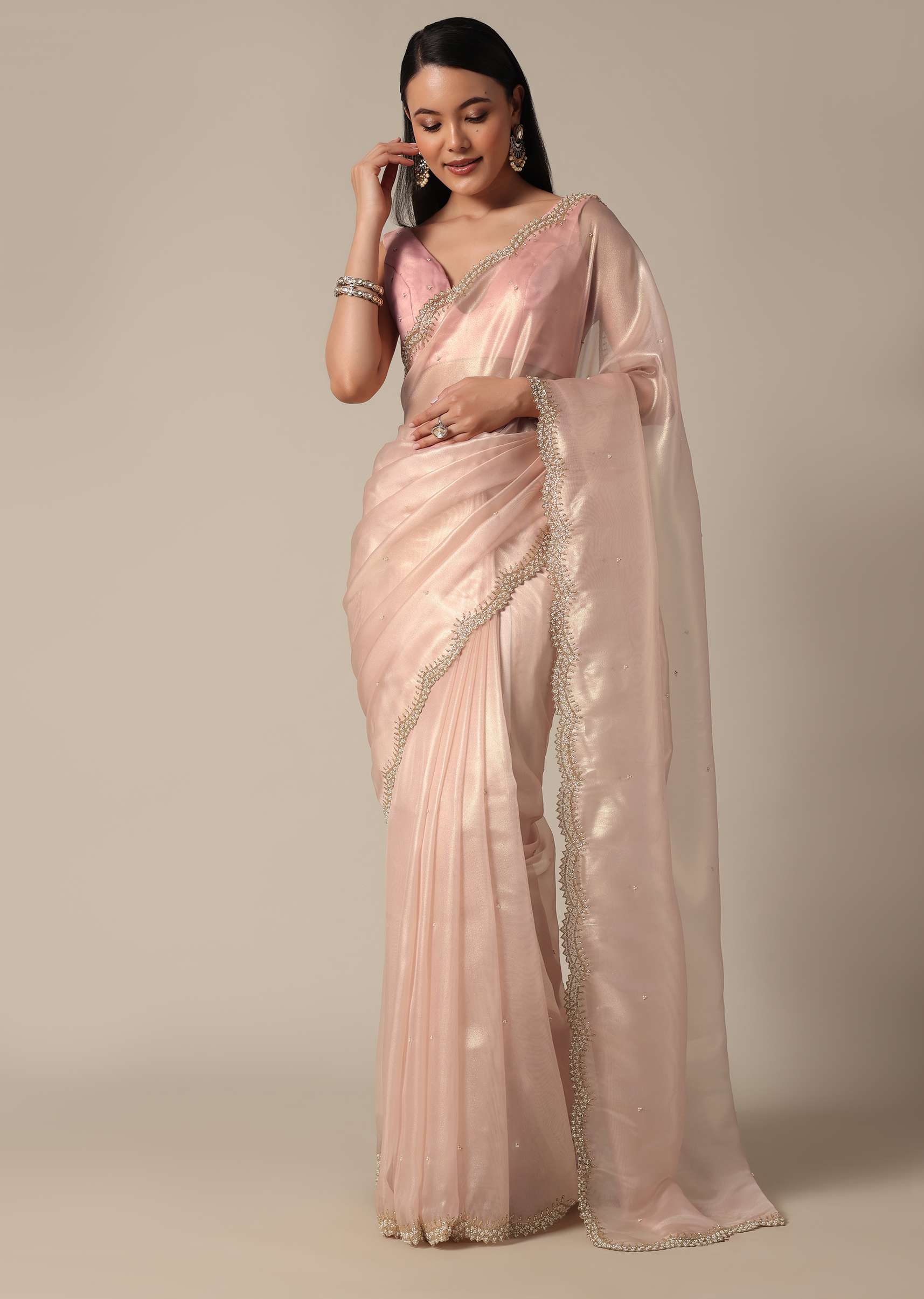 - It features exquisite beads and cutdana embellishments on a scalloped border.
