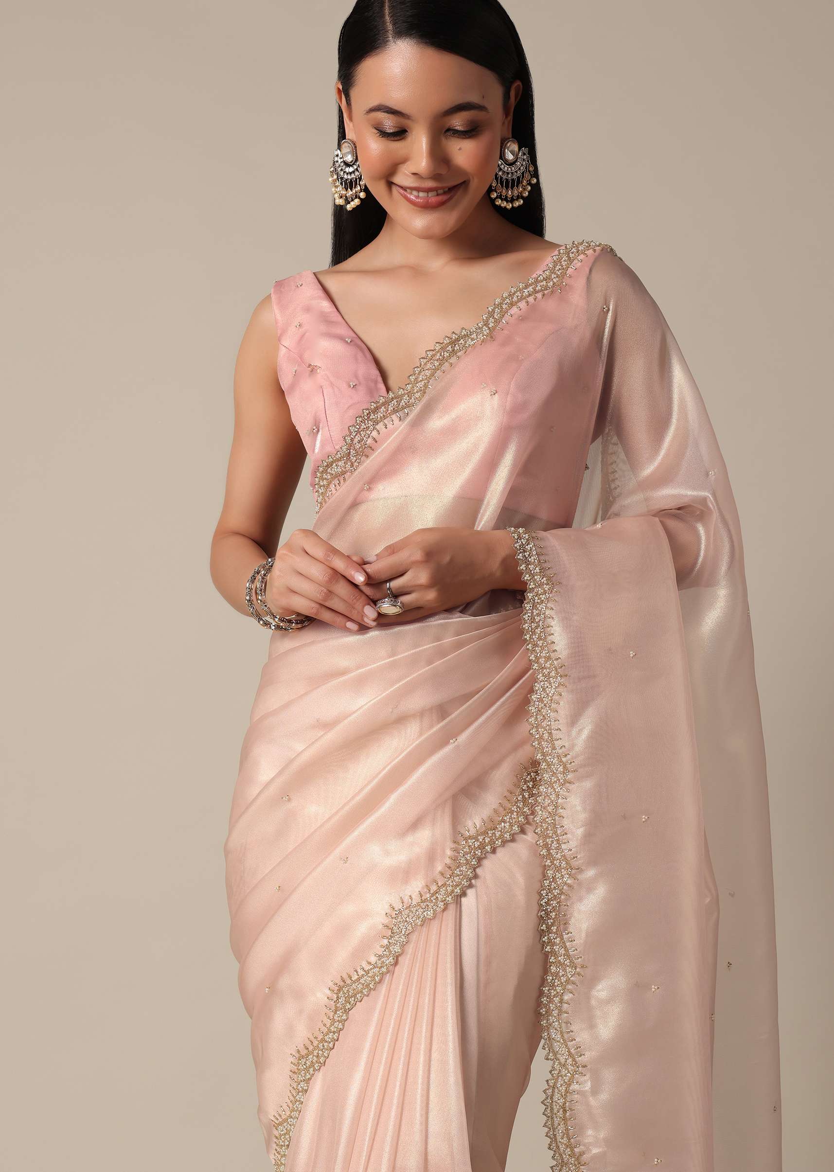 Elegant Peach Saree With Scalloped Border